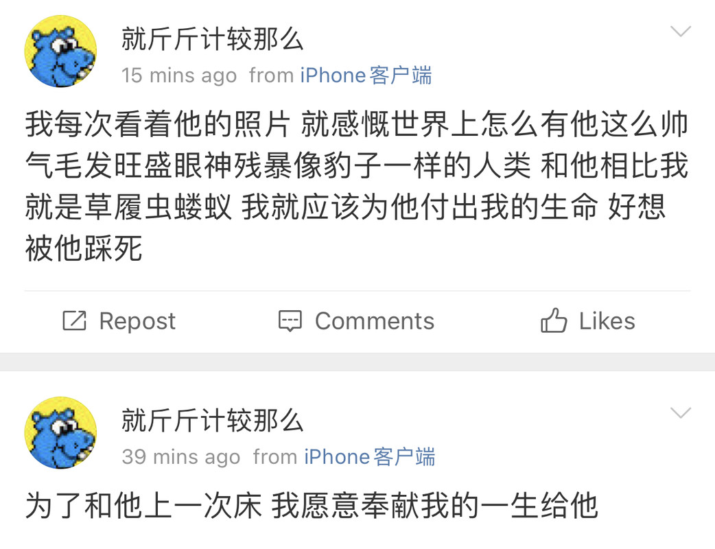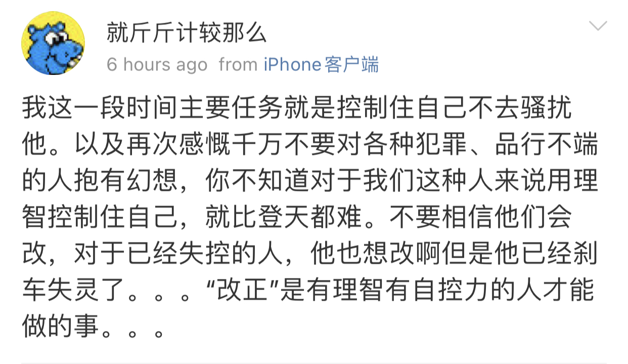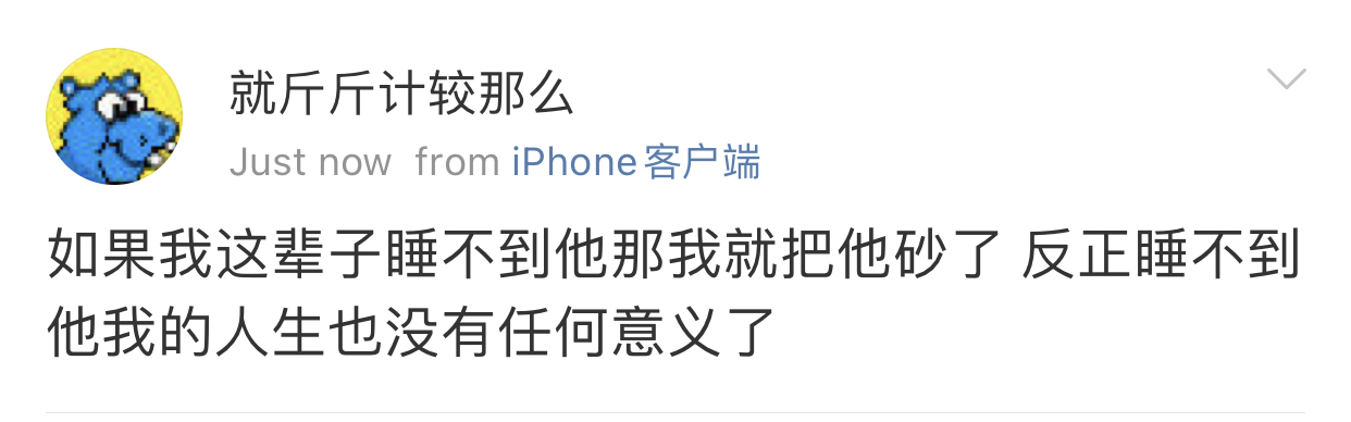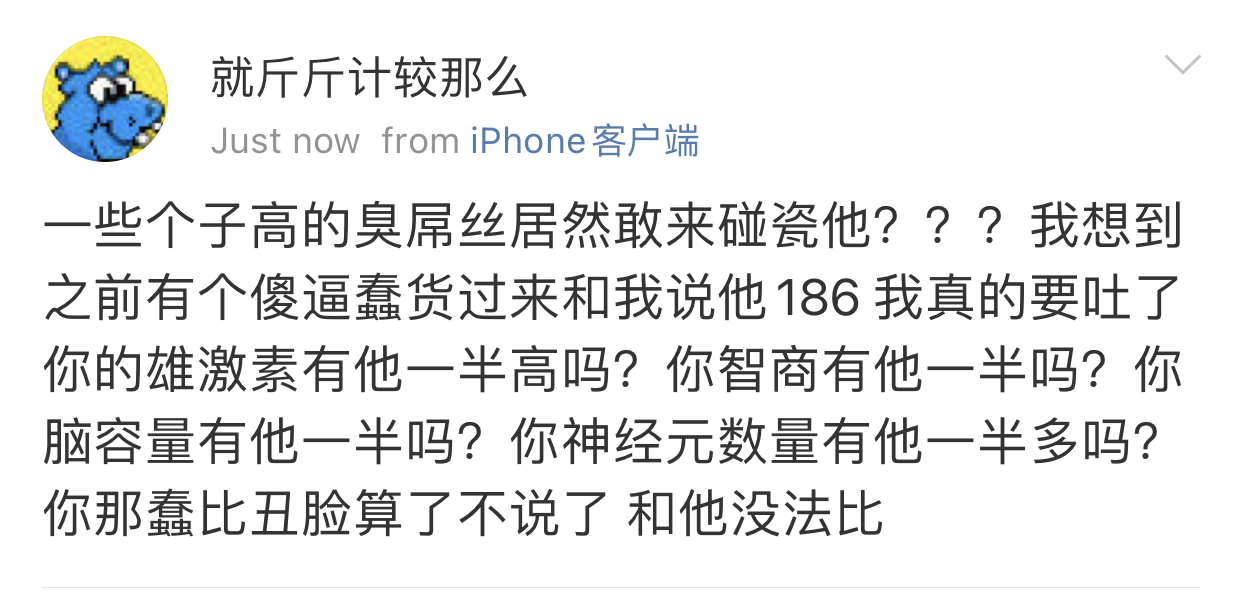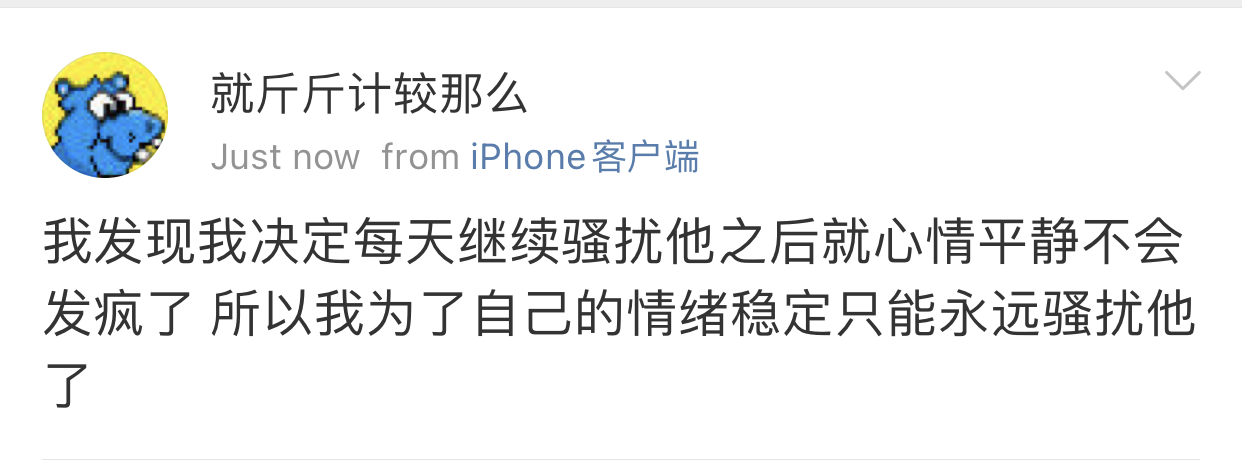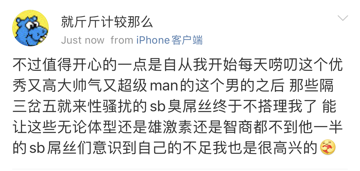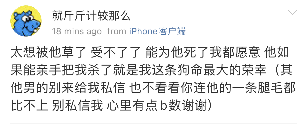 我觉得史行让我无法理解的一点是 虽然我也喜欢骚扰帅哥 也因为骚扰男人被男人拉黑过很多次 可是我绝对不会去骚扰女人 不是因为性别!!我要是男的我也骚扰男人 因为我觉得我不管是男是女我都很慕强只喜欢高帅富[允悲]我对比我穷比我弱小的人没有任何兴趣 给我钱我都懒得去骚扰 我只想去骚扰高帅富 骚扰高帅富我才兴趣满满甚至都控制不住自己 所以我不理解史行 不理解这种喜欢骚扰比自己穷比自己地位低下比自己弱小的人