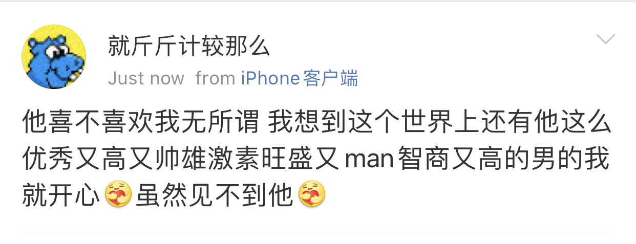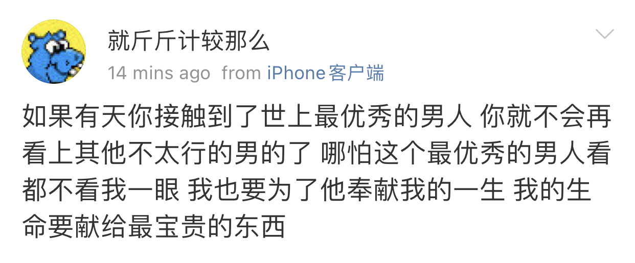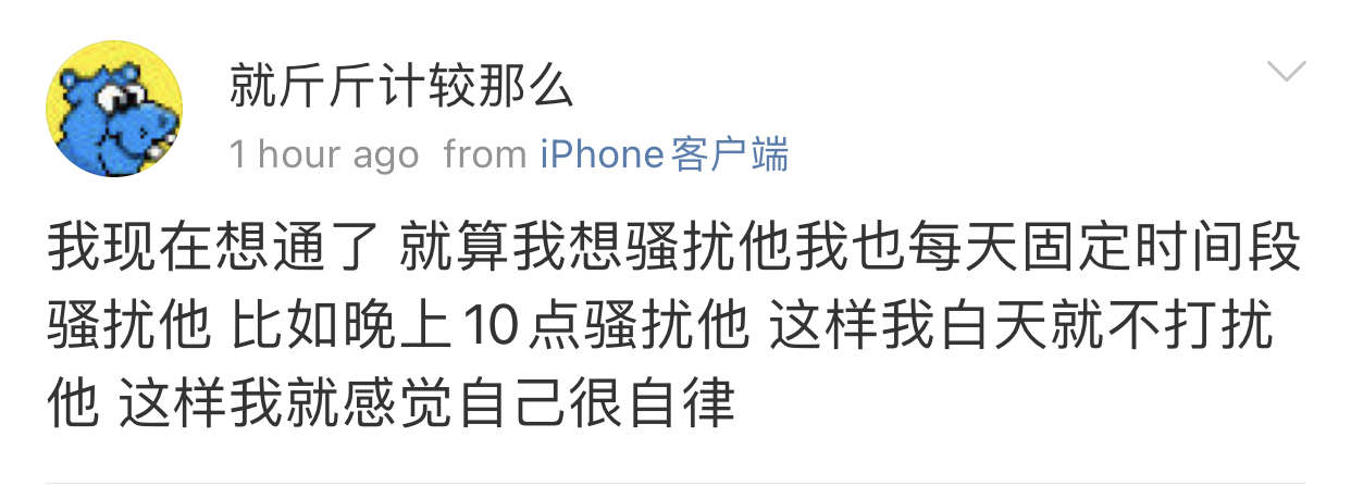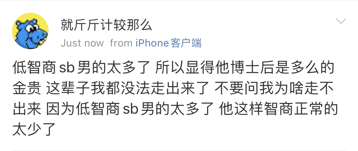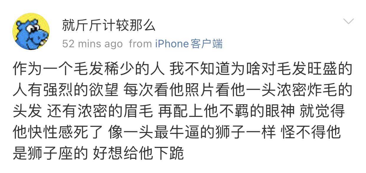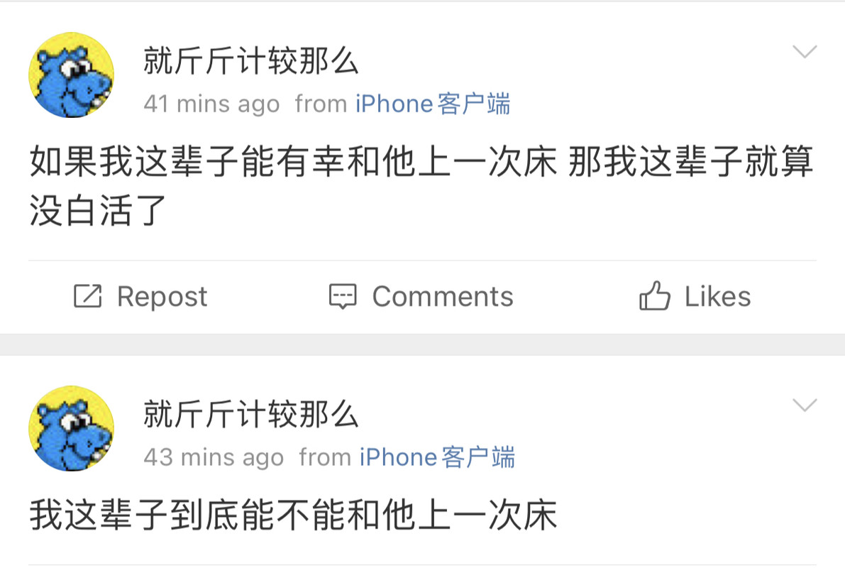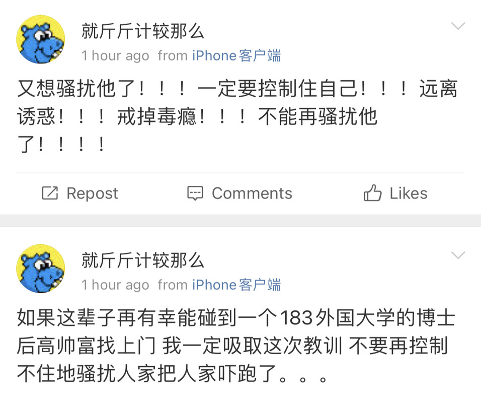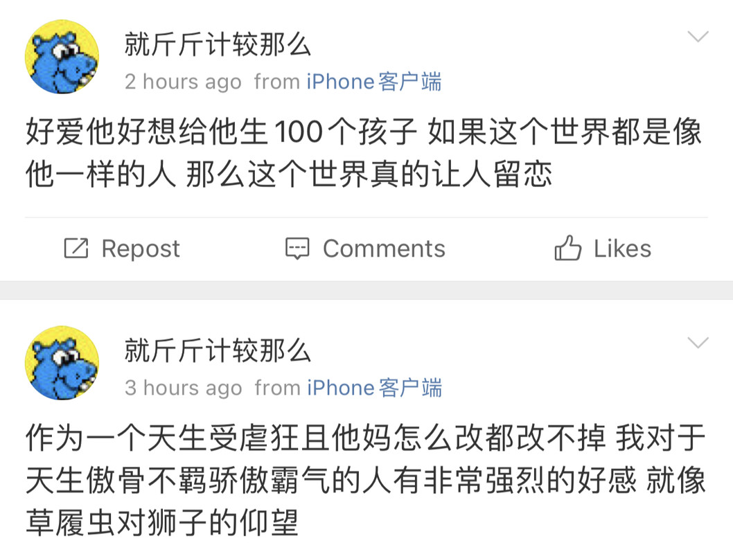 我觉得史行让我无法理解的一点是 虽然我也喜欢骚扰帅哥 也因为骚扰男人被男人拉黑过很多次 可是我绝对不会去骚扰女人 不是因为性别!!我要是男的我也骚扰男人 因为我觉得我不管是男是女我都很慕强只喜欢高帅富[允悲]我对比我穷比我弱小的人没有任何兴趣 给我钱我都懒得去骚扰 我只想去骚扰高帅富 骚扰高帅富我才兴趣满满甚至都控制不住自己 所以我不理解史行 不理解这种喜欢骚扰比自己穷比自己地位低下比自己弱小的人