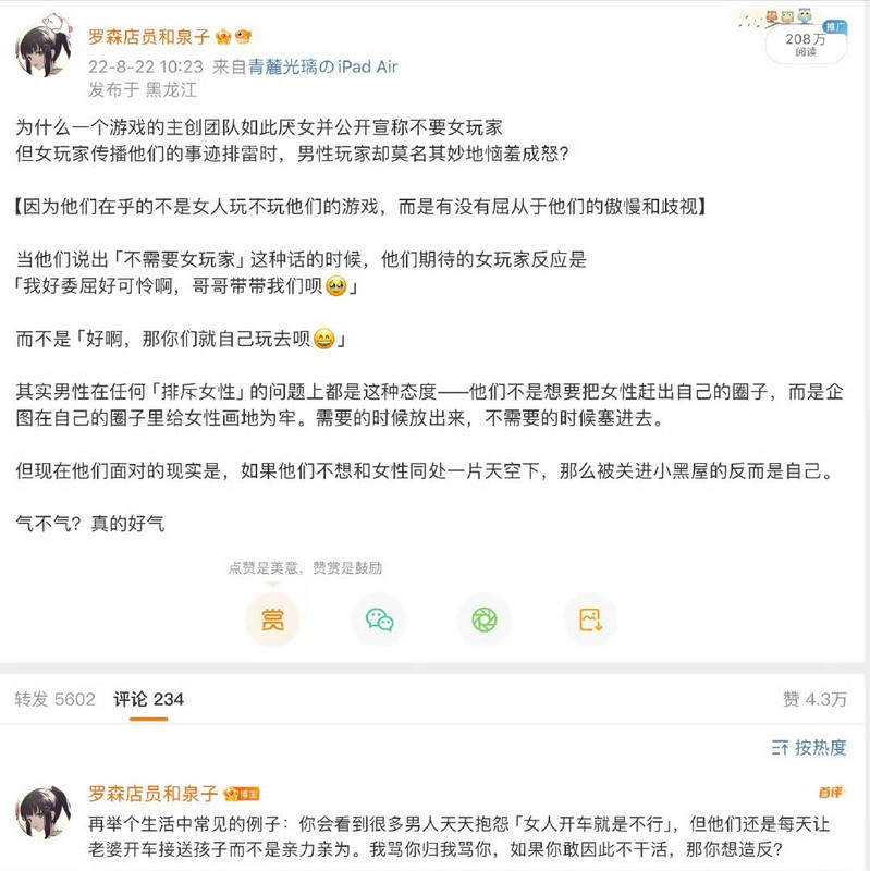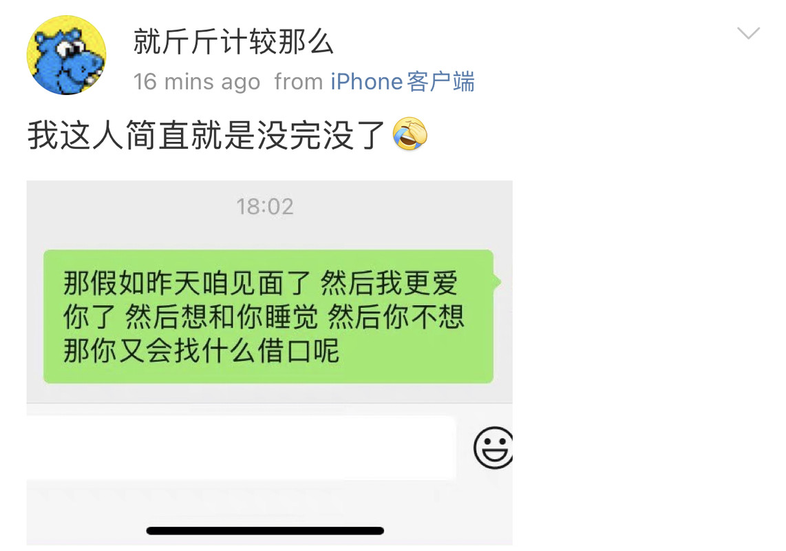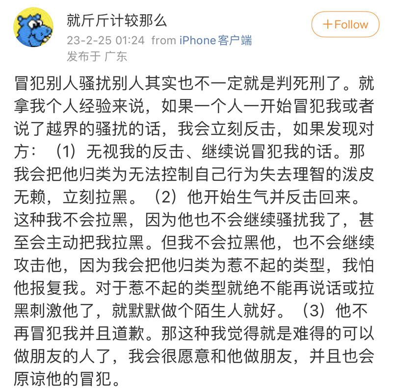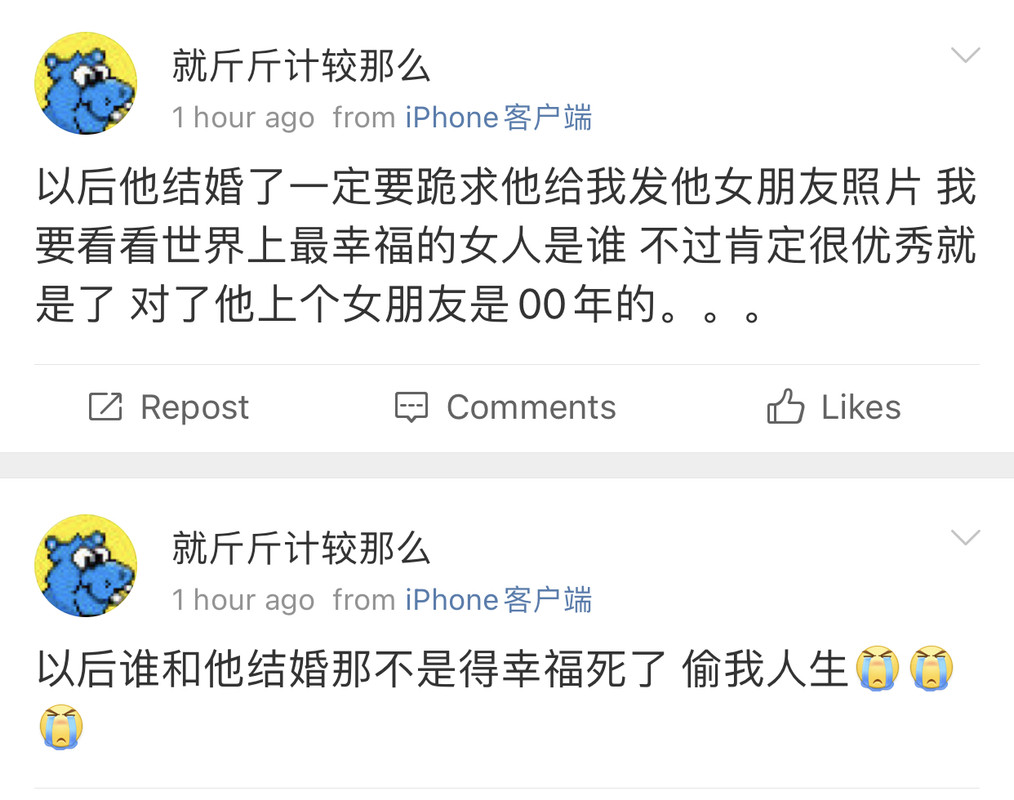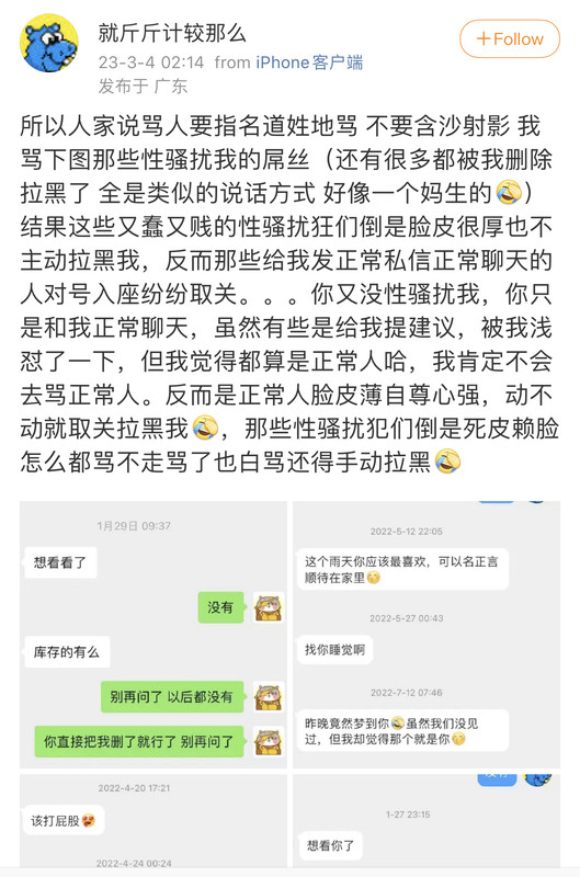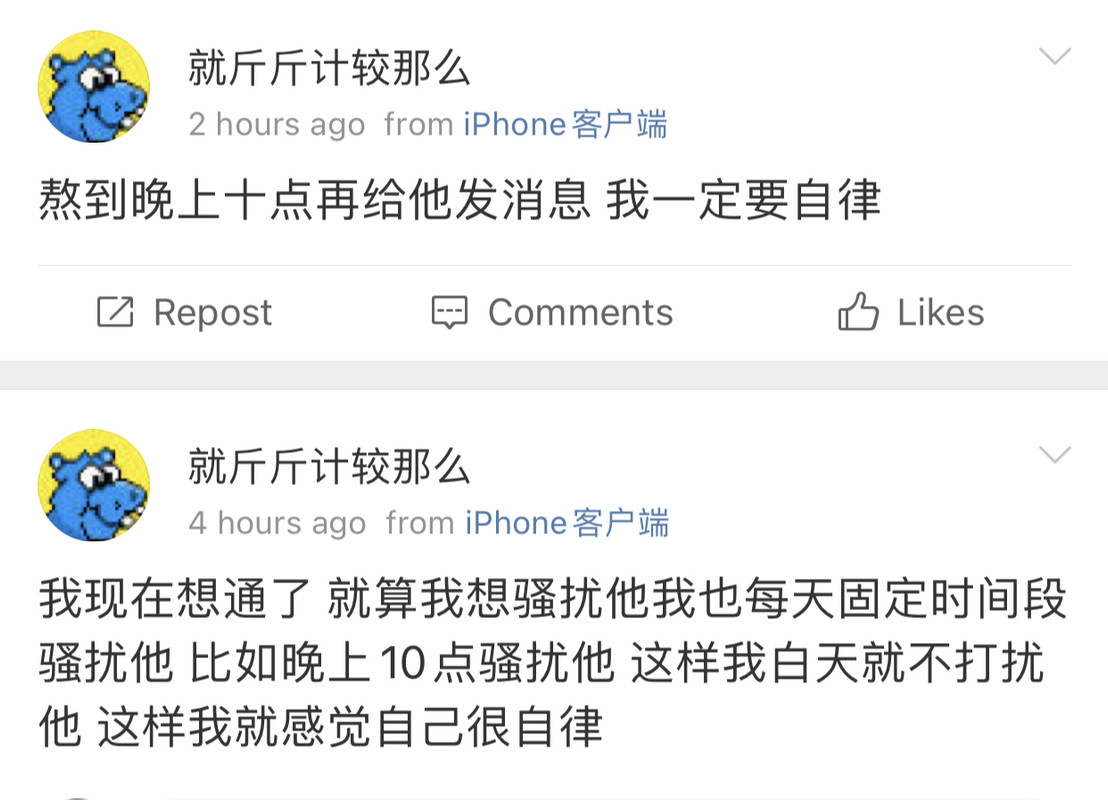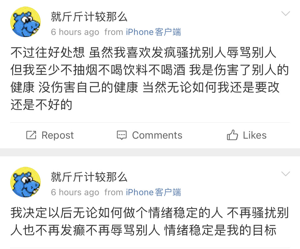 我觉得史行让我无法理解的一点是 虽然我也喜欢骚扰帅哥 也因为骚扰男人被男人拉黑过很多次 可是我绝对不会去骚扰女人 不是因为性别!!我要是男的我也骚扰男人 因为我觉得我不管是男是女我都很慕强只喜欢高帅富[允悲]我对比我穷比我弱小的人没有任何兴趣 给我钱我都懒得去骚扰 我只想去骚扰高帅富 骚扰高帅富我才兴趣满满甚至都控制不住自己 所以我不理解史行 不理解这种喜欢骚扰比自己穷比自己地位低下比自己弱小的人