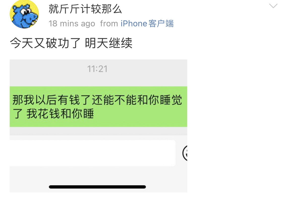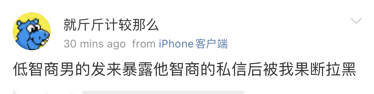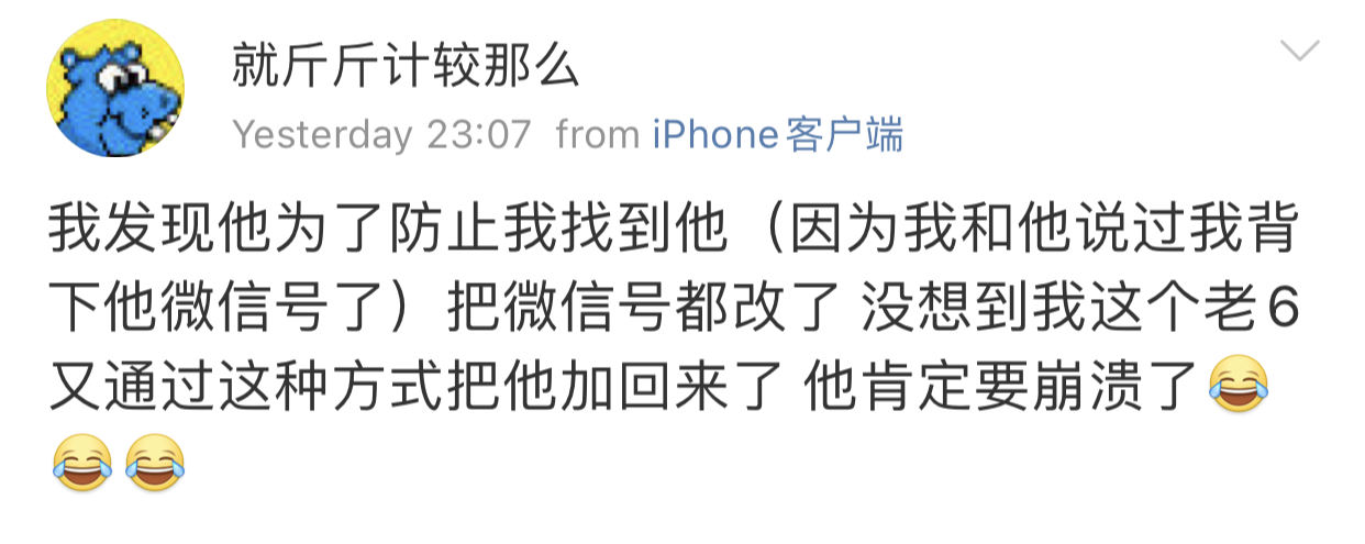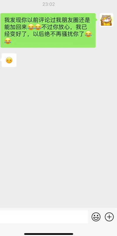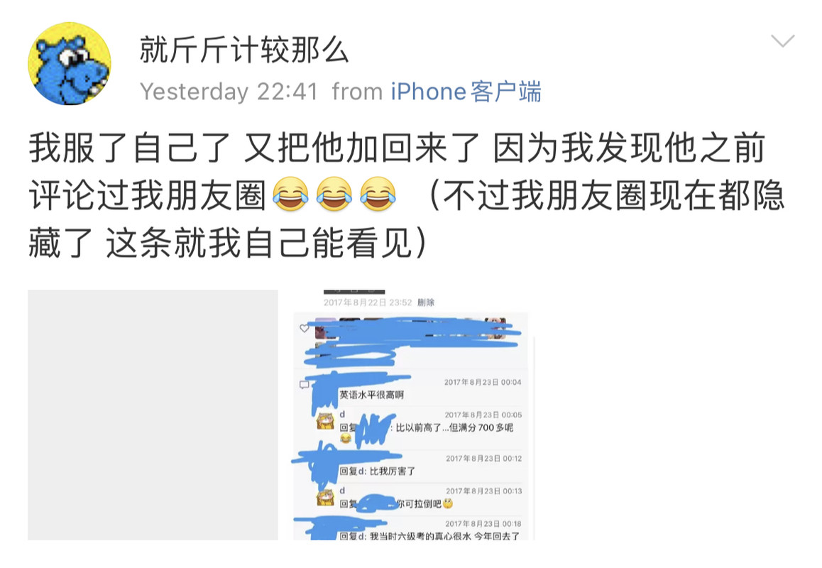 因为前段时间她在微博因为我“创业”参与了对我的辱骂,在我对她不设防,两个微信号都对她开放pyq的情况下。作为一个曾经帮过她,告知过她很重要的信息源,还被她争抢过机会的人。她选择了她的处事方式会做的事情。