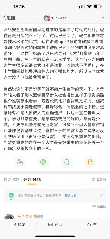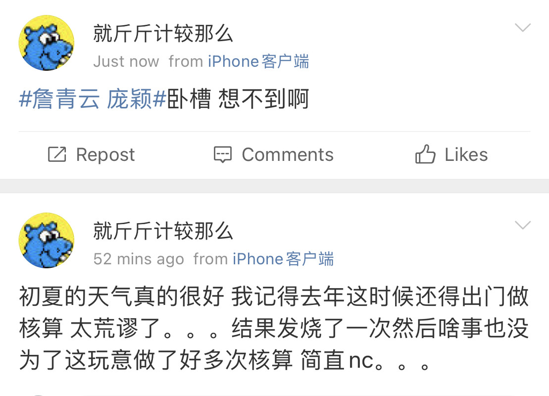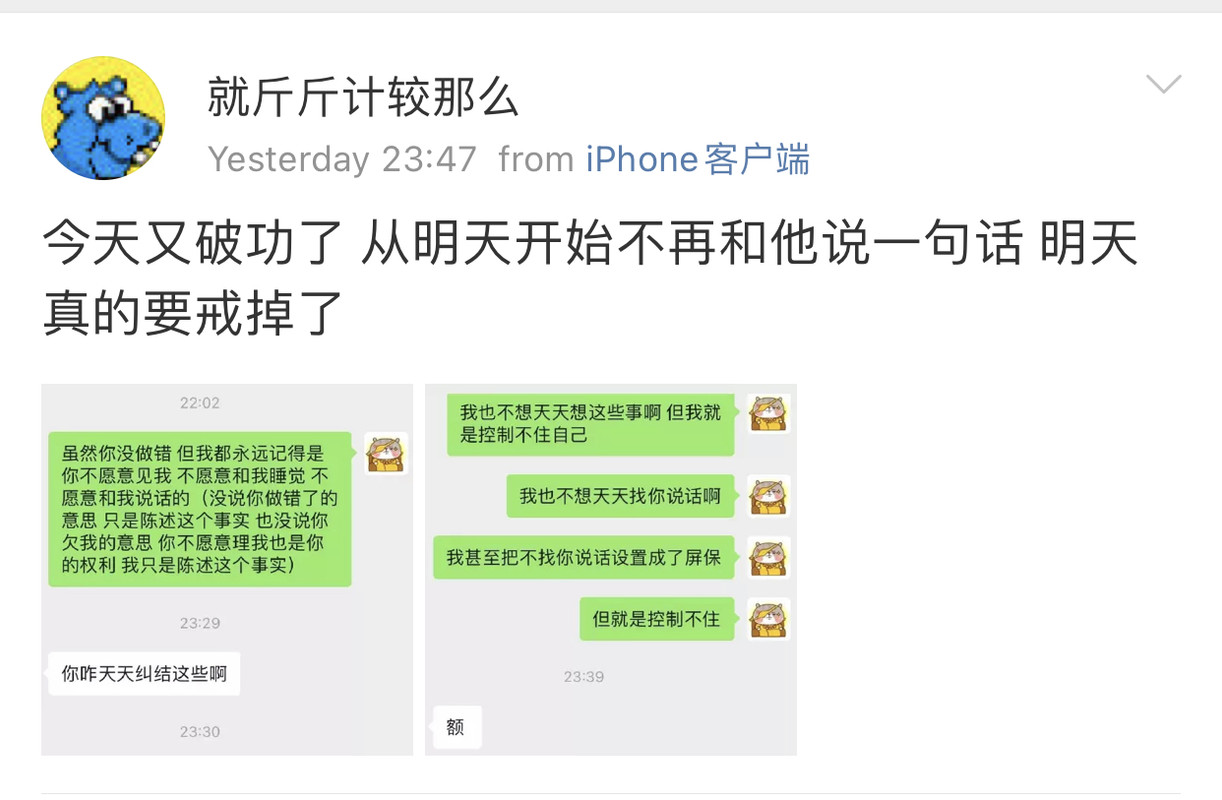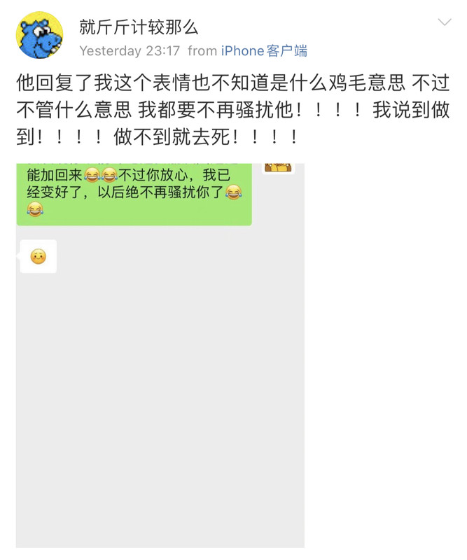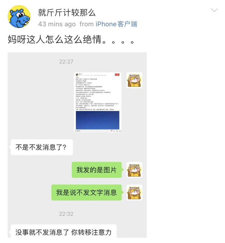 因为前段时间她在微博因为我“创业”参与了对我的辱骂,在我对她不设防,两个微信号都对她开放pyq的情况下。作为一个曾经帮过她,告知过她很重要的信息源,还被她争抢过机会的人。她选择了她的处事方式会做的事情。