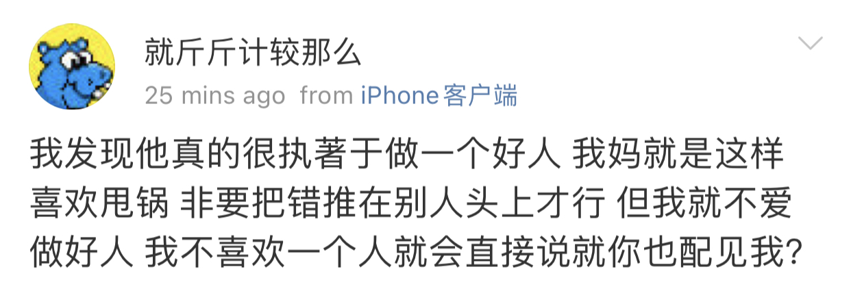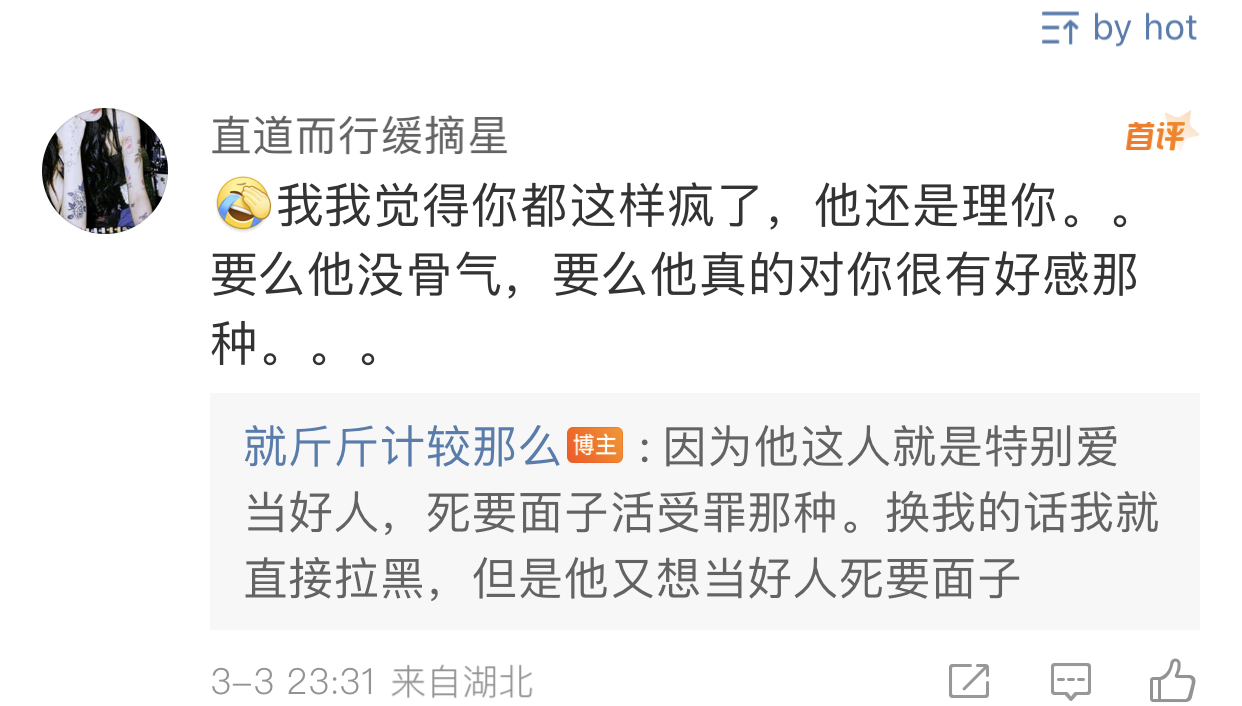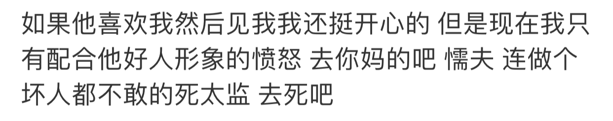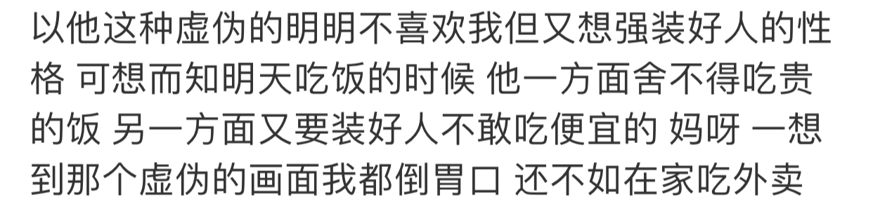 看上一条微博 我就觉得虽然通篇那个男的都在嫌弃他女朋友 但是嫌弃也是分等级的[思考]有种嫌弃是他恨你不把你当人看 会伤害你 骗你的钱 甚至恨不得你去死 但是上篇那个男的嫌弃完还是同情他女朋友的 平时应该也不是那种无情无义赶尽杀绝的人 所以我觉得也还好啦[思考] 毕竟像我们这种条件不好的人大概率会被人嫌弃 但只要不是那种一边利用你剥削你一边嫌弃你甚至希望你去死的那种嫌弃 我觉得就还好吧 整体上我觉得他还是挺好的 不是坏人[思考]