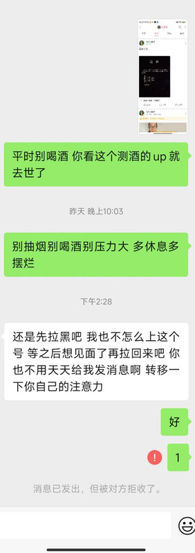 好想知道怎么化解被女生拉黑之后的那种痛苦。尤其是被年轻、精致、好学历、城市里的女生拉黑之后。因为在别人评论区吵架(虽然本意是维护那个被骂学术大吉的女孩子),争吵一作到底能不能被抢,然后都是很多年轻的搞学术的女生和我吵,因为我这人说话也比较low也爱激动,然后被其他女生拉黑了。我就用小号去看拉黑我的女生,她们是那种高学历的搞学术的很高级的年轻女孩子,不是我这种很low的大妈,然后我就特别特别痛苦。然后我用小号去问她为啥拉黑我,现在问完了她还没回复我,可能没看见吧,我现在害怕的浑身发抖,特别害怕被再次拉黑。还有以前也被一个高学历在美国当律师的女生拉黑,我也特别痛苦不知道该怎么排解。还有以前被一个上海的高学历女生拉黑,我也很痛苦。现在一想到就难受得无法走出去。