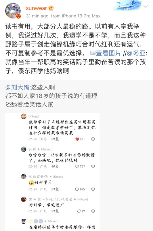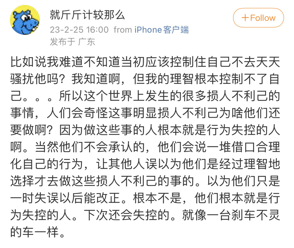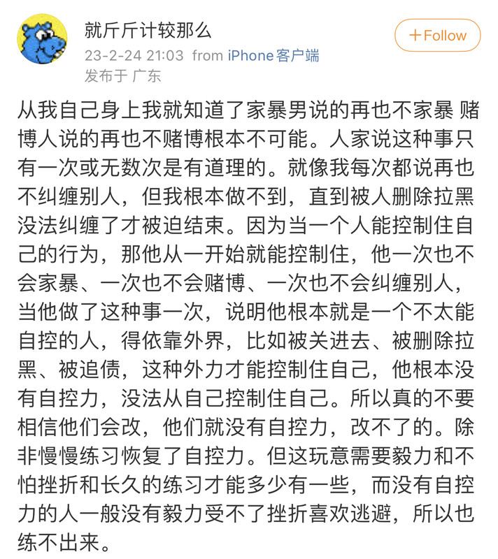 今天又在和网友吵架,我发现我比以前强的一点是,我以前和别人吵架争论啥东西,我就会特别害怕别人觉得我是笨蛋觉得我不聪明,然后为了让自己看起来聪明点,我就会吵个没完,并且特别上头,特别害怕别人看不起我。但现在我就能做到该干嘛干嘛了,因为我知道:自己的利益(比如自己的时间精力、自己手头上做的事)比看起来是否聪明要重要得多!!!!我以前,特别特别害怕自己看起来很笨,这个主要是小时候,我只要表现的傻一点笨一点,我爸妈就会恨得咬牙切齿的,恨不得把我撕碎[允悲][允悲]所以就导致我特别害怕自己看起来不够聪明,然后导致我的整个人生都活在不懂装懂里,因为我不敢面对自己的笨和傻,我只能装,自欺欺人。所以我以前看书学习全是在自欺欺人,我根本啥也没学会。然后继续说我和别人吵架的那个视频,是一个剪辑,一个训狗的和狗主人连麦直播解决狗的问题,但这些狗主人总是听不懂训狗的说的话,然后这个训狗的就开始发飙,不停重复自己说的话,狗主人也在不停重复自己说的话,看起来狗主人很傻,所以就剪辑出来让人嘲笑她们。这要是放到以前,我以前看到这种视频就会特别害怕,因为我特别害怕被人嘲笑不聪明,所以我就会想:“我一定不能和她们一样,我一定要努力回应那个训狗的,遵守他说的话,让我自己看上去不像个傻子”。现在我完全不会这么想!!我的想法是,那些看起来很傻的狗主人们,好像听不懂这个训狗的说的话,原因有两种:(1)确实没听懂。(2)听懂了,但是不愿意执行,心里有疑惑,不信任这个训狗的,但也不敢明说,就表现得好像听不懂。比如训狗的让狗主人去打狗,狗主人不愿意打,就支支吾吾的不停说着车轱辘话。所以,我觉得当我遇到这两种情况,放在过去的时候,因为我特别害怕别人觉得我笨,我就会开始不懂装懂,或者明明心里有不信任和不情愿,也硬着头皮去执行。但我现在不会再这样了,有疑惑没听懂一定要问,如果对方不耐烦也要问,一定一定要自己弄懂,千万不能迫于压力自欺欺人!!!如果觉得不信任他给出的方案,千万不要迫于压力就算了,要和他沟通,讲出自己不信任的原因,进一步沟通,一直到疑团解开为止。而且在这个过程中一定会遇到各种压力,因为别人都怕麻烦,这个可以理解,但是我们自己的事一定要自己抗住这些压力!!我过去的人生,因为我太害怕别人觉得我傻我笨了,所以别人一给我点压力,我就害怕了,我就牺牲了自己的利益,就开始不懂装懂了。所以我就这样因为各种压力,因为害怕别人觉得我傻我笨,而不懂装懂了半辈子,把半辈子时间都浪费了。所以我现在,不管别人觉得我再笨再傻,我都要顶住压力,去一个字一个字的学习,去搞懂,去执行,去掌握自己的人生。