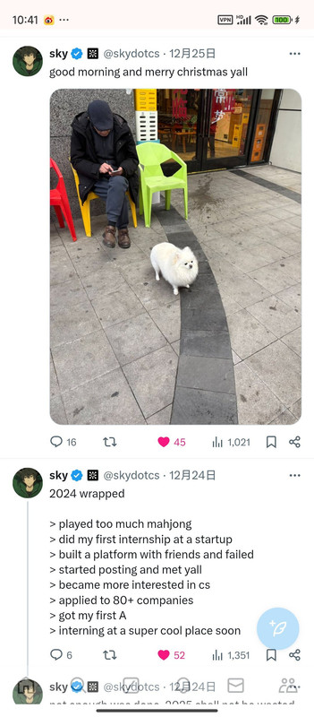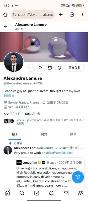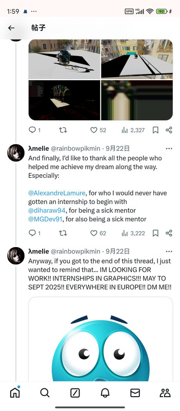 就是之前在撩我的那个巴西程序员小哥(推特上的互关),他本来误以为我是个有本事的程序员,然后后来发现我是个35岁没工作自学编程的老女人[允悲][允悲](后来我怕其他的互关再误会我,就写了条推特说我是个35岁没工作的人,在自学编程,看书的速度是2页每天[允悲][允悲],所以没有任何成就。并且把这条置顶在首页了,免得再发生啥误会了[允悲][允悲]),然后他就不再搭理我了。然后我不是天天视奸他推特主页吗,发现他最近又在撩一个amd(大公司啊!!)工作的女程序员,而且也是图形学的程序员,(他也是搞图形学的,游戏的底层开发),总是评论她的推文,她也会评论他的推文(推特的主页能看到一个人所有发出去的评论,因为推特的机制是每发出一条评论就相当于发了一条推文,只是这条推文是串在别人的推文下面,但是也相当于一条推文)