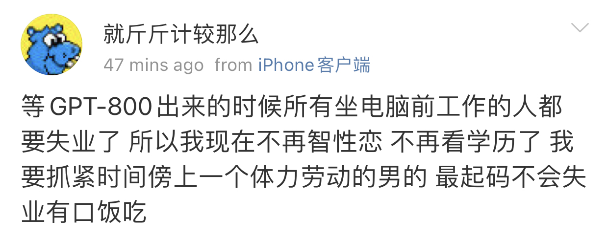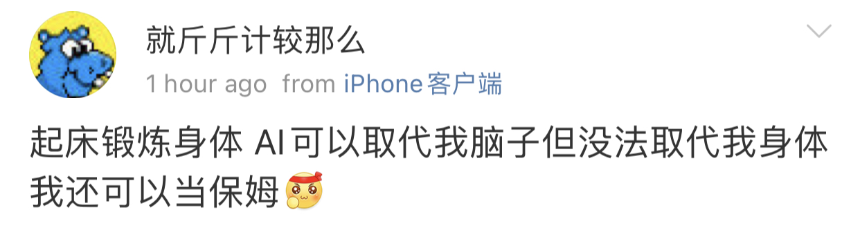 AI三年内要终结编程(不是我说的,别人说的),好,那我不编程了,我也去搞AI,可是搞AI的话openai用成千上万台GPU,耗费几百亿美元训练出来的AI,我怎么可能搞得过它,我最多买一个GPU就倾家荡产了。。。思来想去只能锻炼身体去干体力活了,还好AI没有身体[苦涩][苦涩][泪][泪]