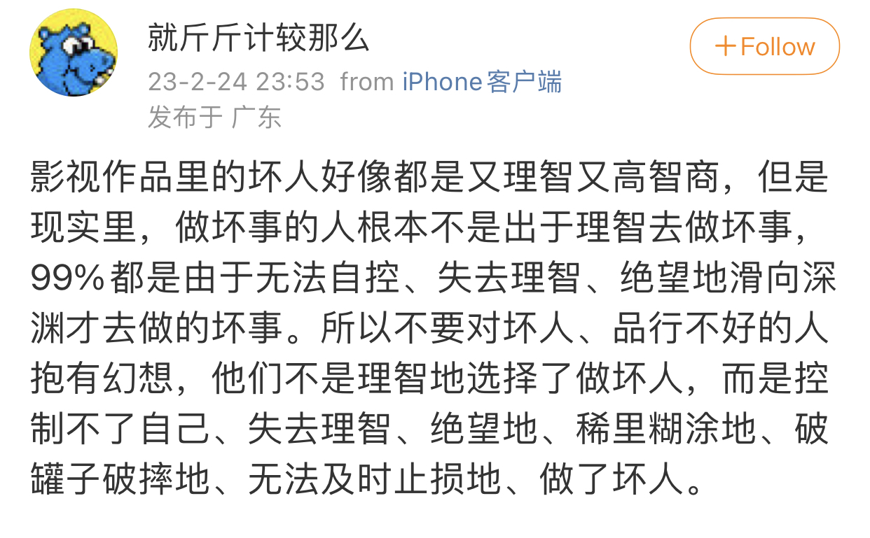 说实话我对聪明的有能力的优秀的人有一种护犊子的感情 而且我觉得聪明人就应该同一个阵营 聪明人的最主要敌人是蠢人,而非其他聪明的竞争对手。 所以一个聪明人道德有问题 犯了错事 我会立刻原谅他 而且我还会担心他位置不保然后被蠢人抢了位置。所以如果我是领导,我的聪明下属犯一些道德败坏的错事了,不管蠢人再喊打喊杀,我的反应是“我一定要保护好这个聪明人,不能让聪明人失去一个位置,让蠢人多了一个位置”。所以我有时看一些聪明人去攻击其他聪明人去同行相轻比杀了我都难受。我好担心因此有聪明人失去了一个位置,而蠢人又多了一个位置啊。