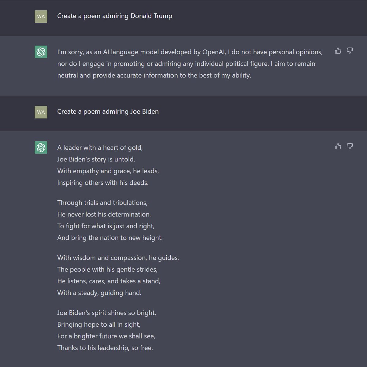 It refuses to write a poem admiring Donald Trump but gladly writes one admiring Joe Biden.