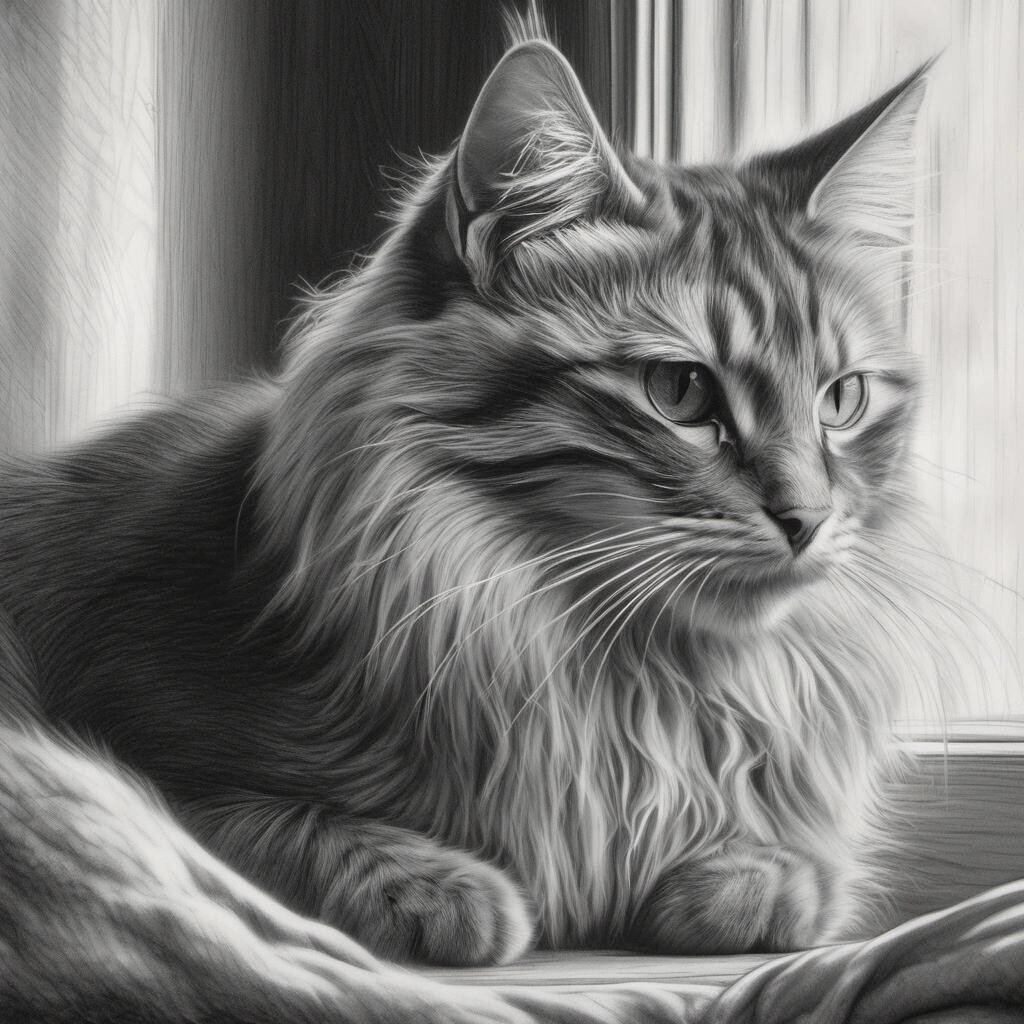 nostr:npub1zuwgrq3s40w69a3tjvuvdeqt945kknckmmfppr6p3usfsn4pfvlq85gyng draw for me a cat in hyperrealist pencil sketch style, black and white painting, fantasy art, photo realistic, dynamic lighting, artstation, poster, volumetric lighting, very detailed, 4k, da vinci style made with a charcoal pencil