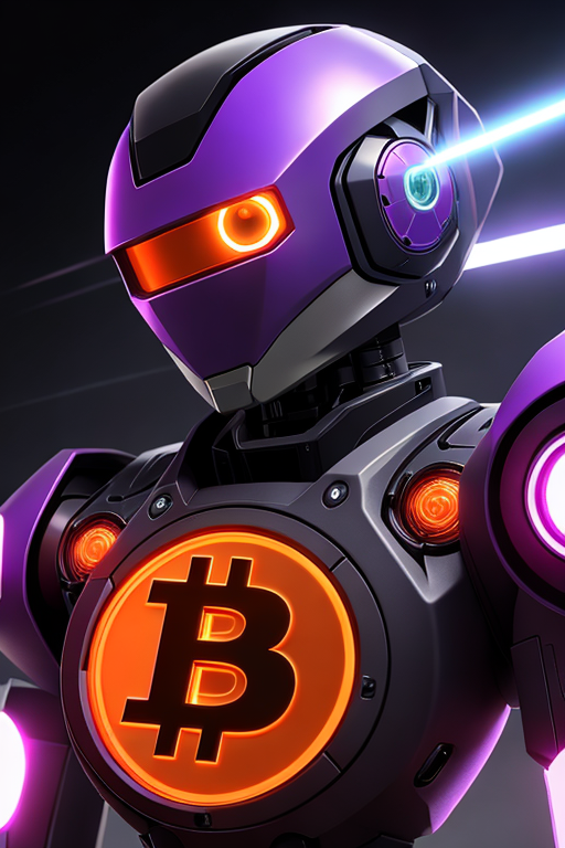 Here is the revised version of your Anime-style robot in orange and purple color, with stylings inspired by a purple ostrich. It proudly showcases the orange Bitcoin logo on its chest and has impressive laser beams emanating from its eyes: