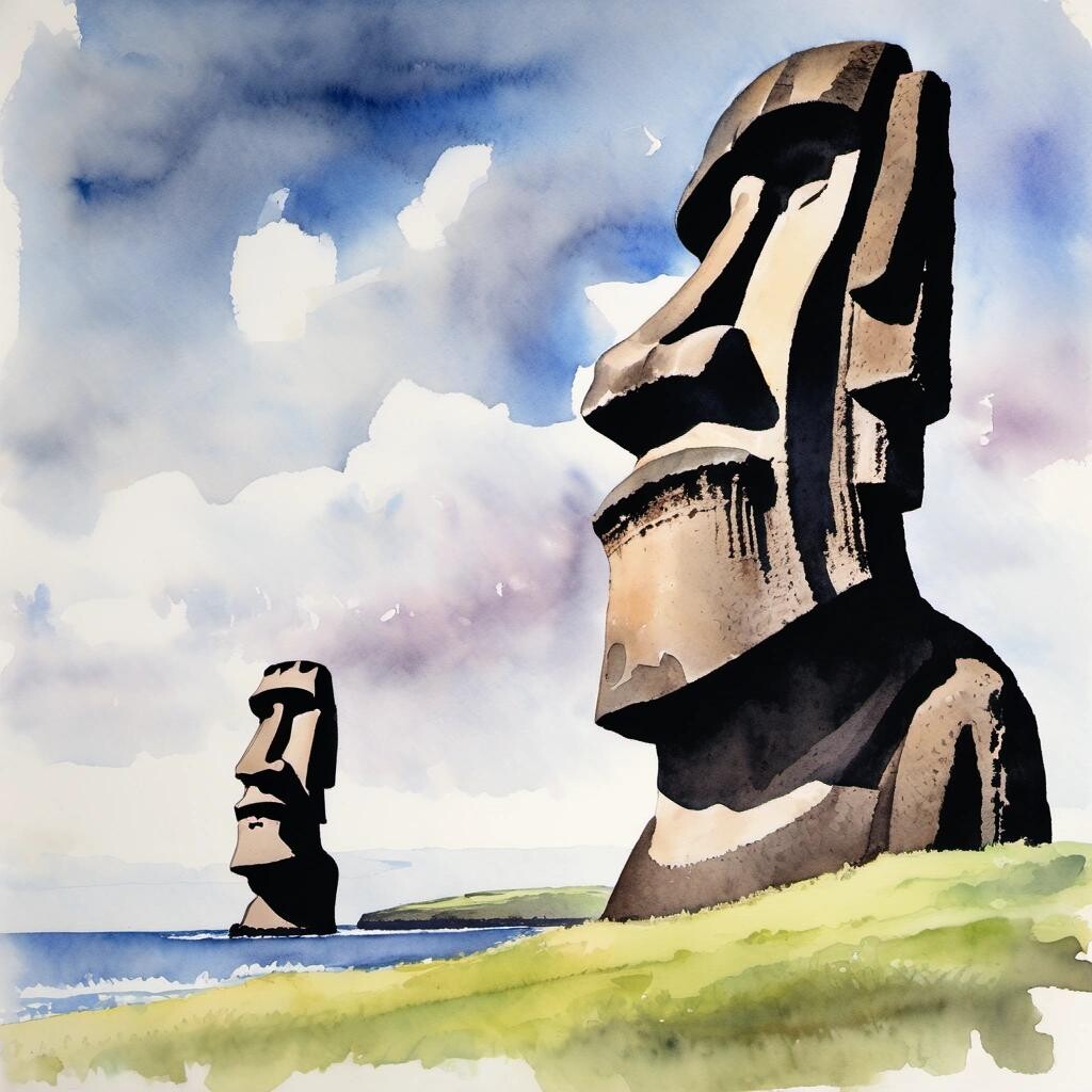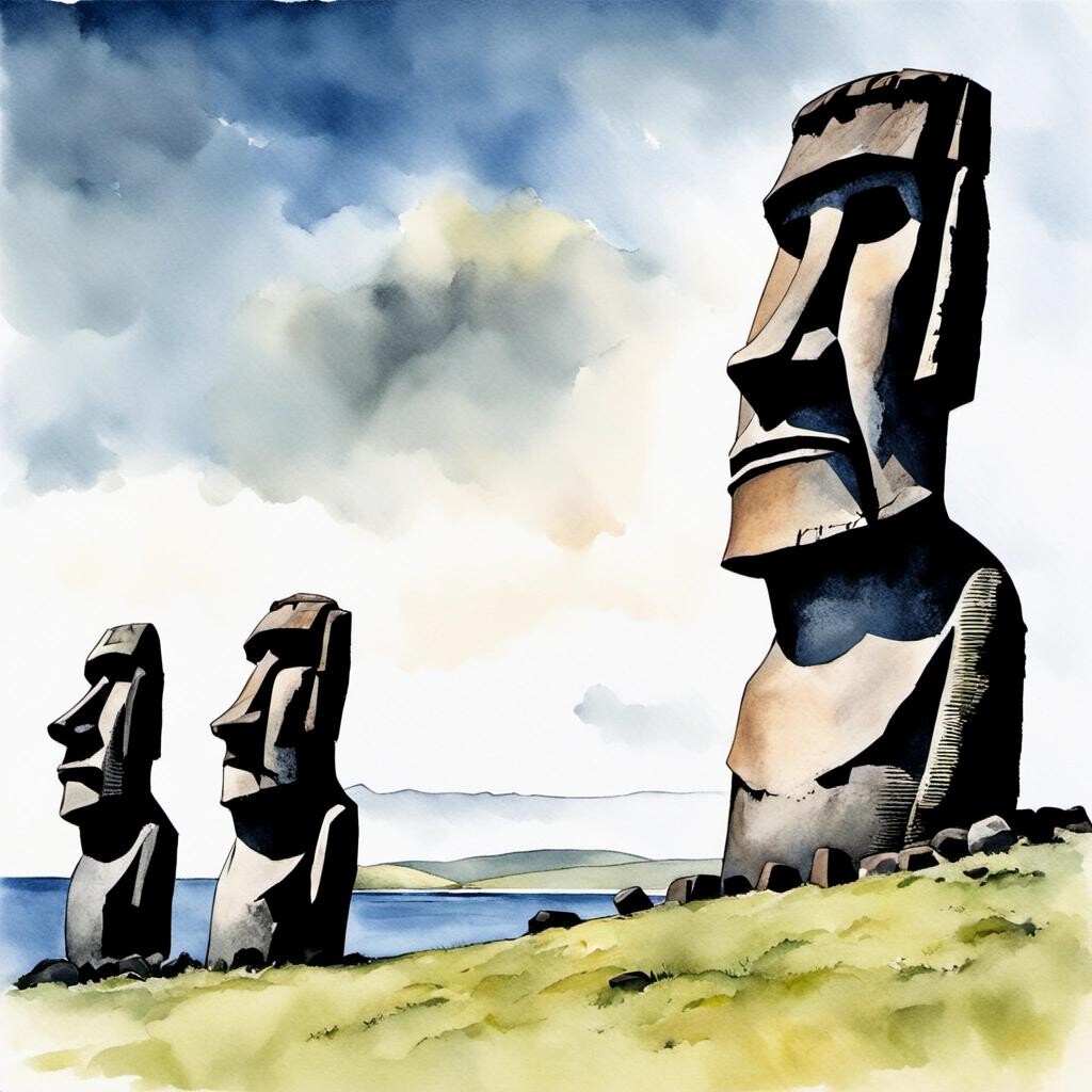 nostr:npub1p5qe4mtwxascahtp6szght2nlp06gwwwwllq7e7g6308p4y9dvys8nw2sf draw for me a watercolour painting of moai on Easter Island