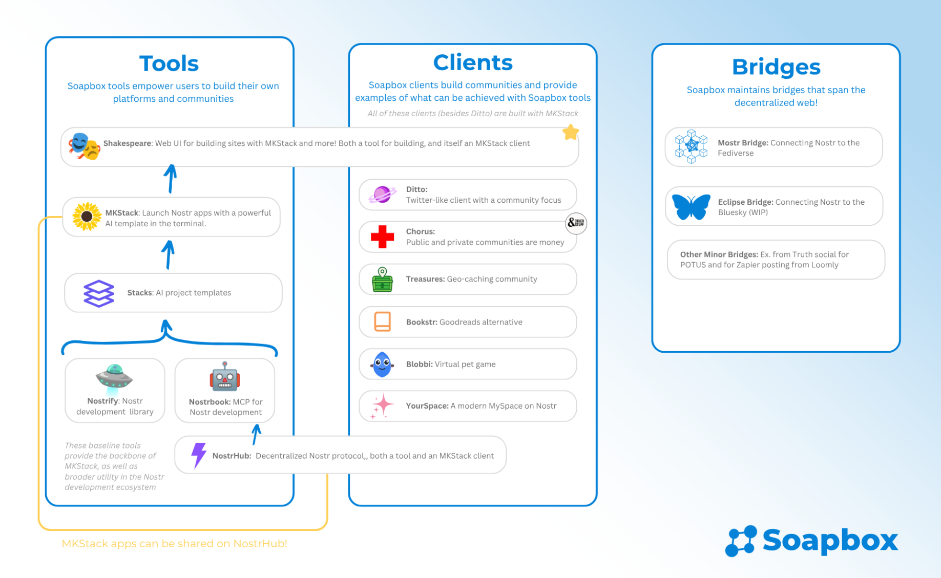Shakespeare is an AI powered tool for building web applications. Shakespeare uses MKStack (a Stacks template), Nostrbook MCP, Nostrify library, and NostrHub events. Shakespeare pulls most of the previously mentioned tools together.