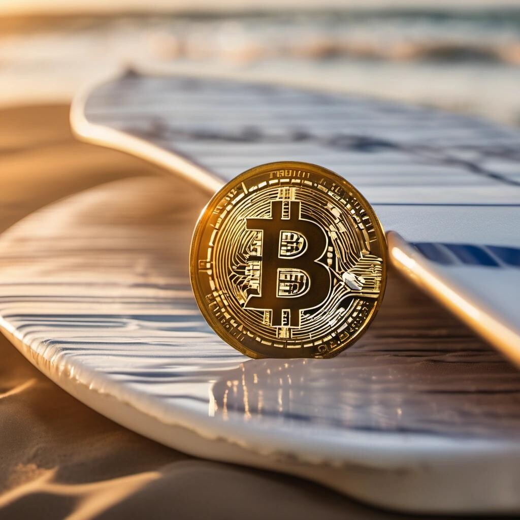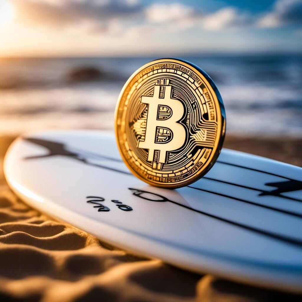 Prompt: bitcoin logo on a surfboard, high quality photography, 3 point lighting, flash with softbox, 4k, Canon EOS R3, hdr, smooth, sharp focus, high resolution, award winning photo, 80mm, bokeh, ar 4:7