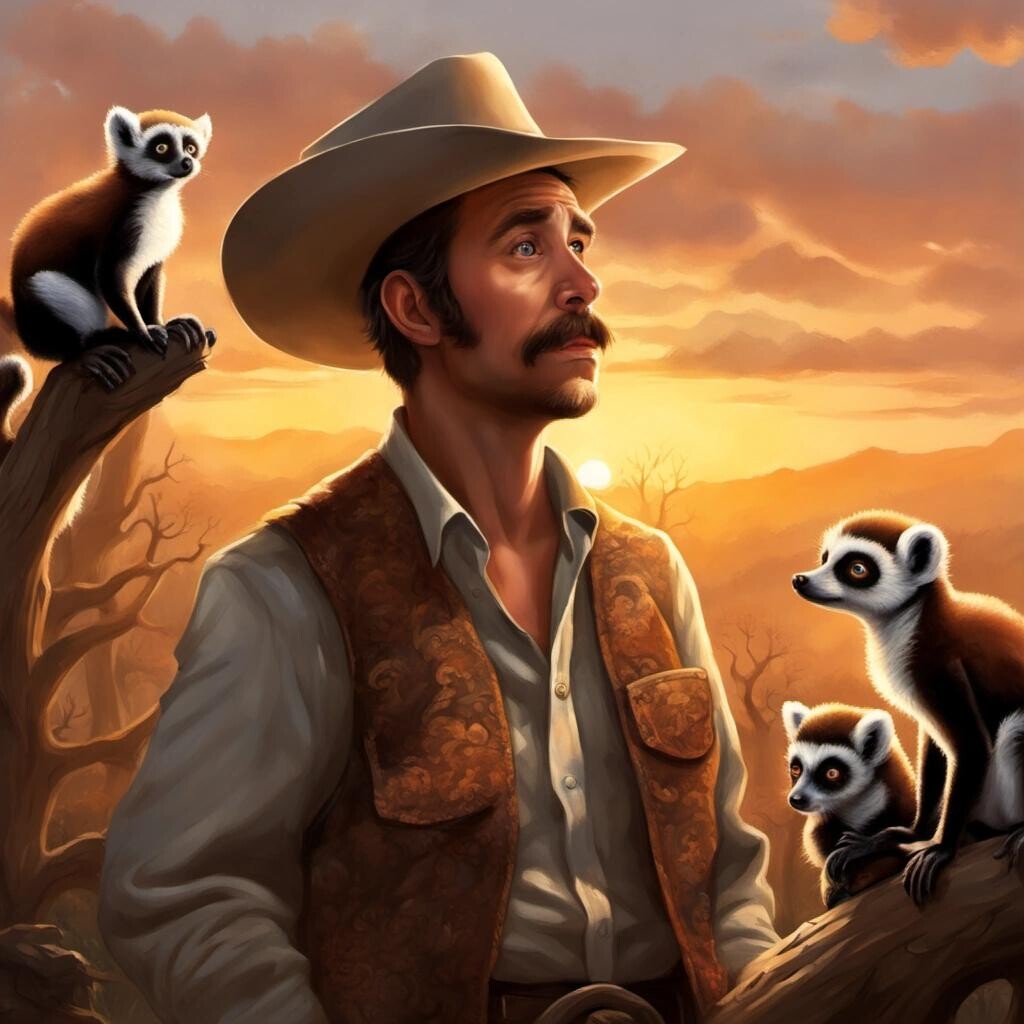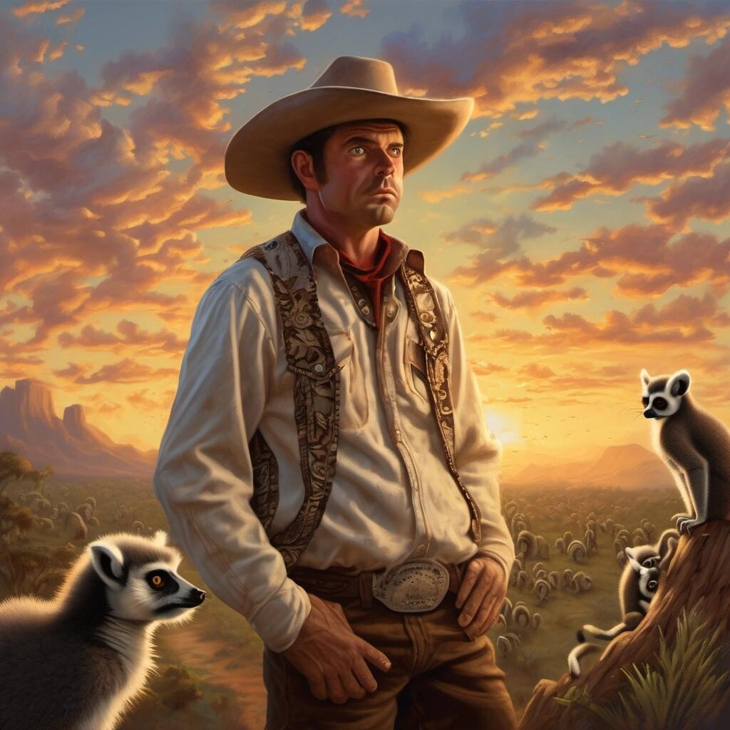 Prompt: a confused cowboy that is covered in hundreds of lemurs in front of the setting sun in the style of Thomas Kinkade.