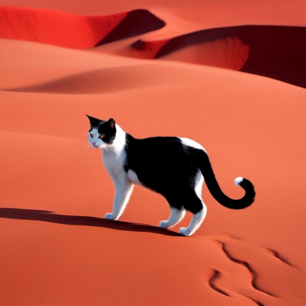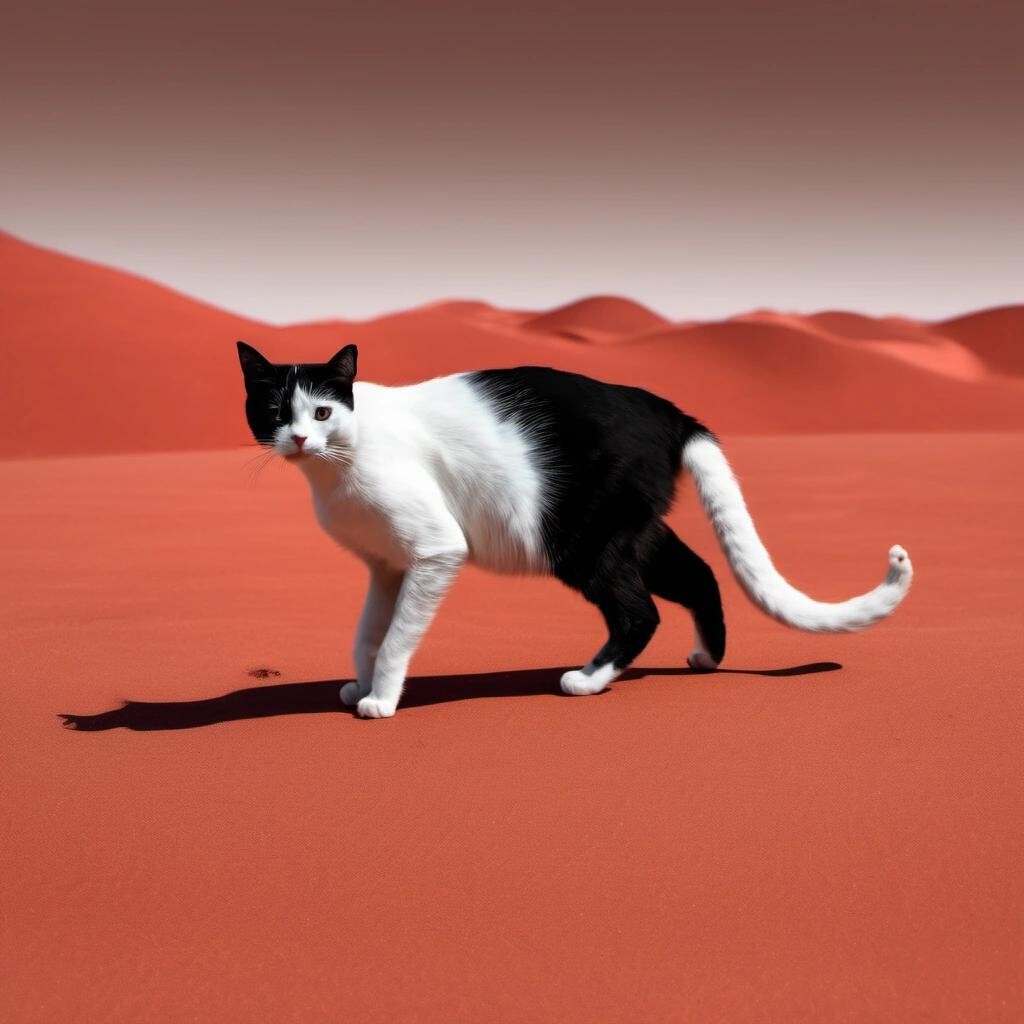 Prompt: a black and white cat walking in a red sand desert, reflections, illusions