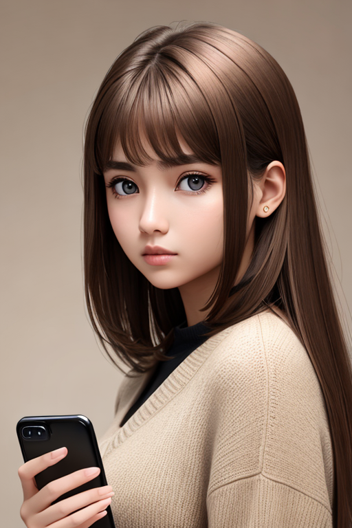 midjourney bot: nostr:npub102ca8pnhy26vh2akepgr4vleyew65nuzug5val3sycslfe0wruwqzezyfp imagine girl looking confused at her phonescreen, beige brown minimalist background, she has laser eyes and lightbrown hair, hyperrelalistic