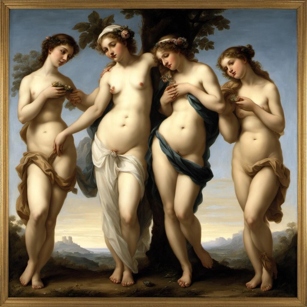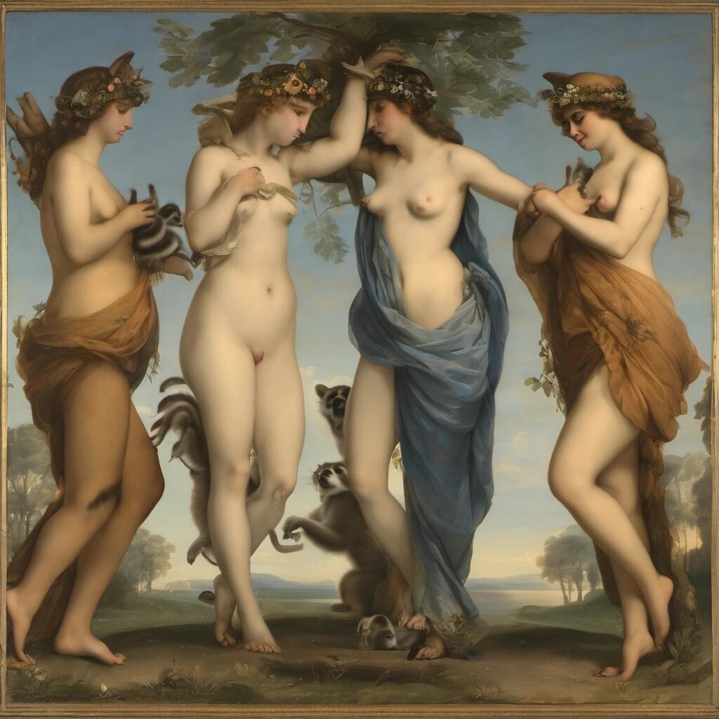 nostr:npub1p5qe4mtwxascahtp6szght2nlp06gwwwwllq7e7g6308p4y9dvys8nw2sf draw for me The three graces by Rafael except the women are raccoons