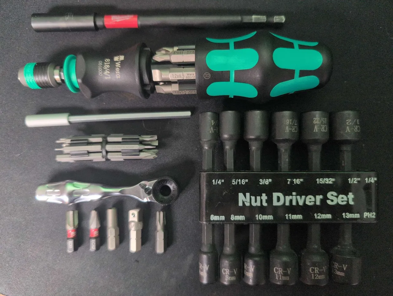 After reviewing what I have and what I need in the field, I realized that fancy new wiha handle isn't making it into my carry set up. I'll use the wiha 758 adapter with the wera driver when I need the precision bits, so only the precision bits and extension get included but no dedicated handle.