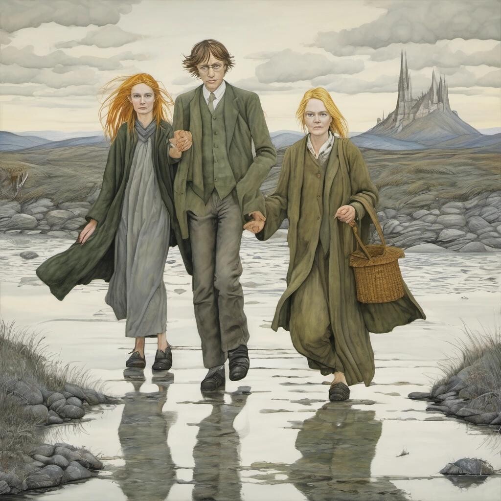 Prompt: They're taking the Hobbits to Isengard! Erin Hanson, Edward Gorey, Erik Johansson, Dee Nickerson, Bernard Buffet