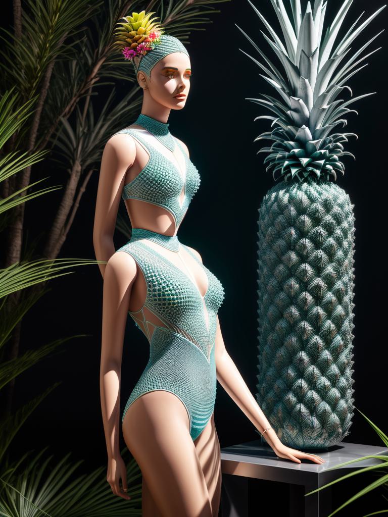 Prompt: "“ a beautiful mannequin covered in geometrical 3 d print, a portal to a new world, flowering pineapples and orchids, transcendent, vibrant color, clean linework, finely detailed, 4 k, trending on artstation, photorealistic, volumetric lighting, octane render ”"
