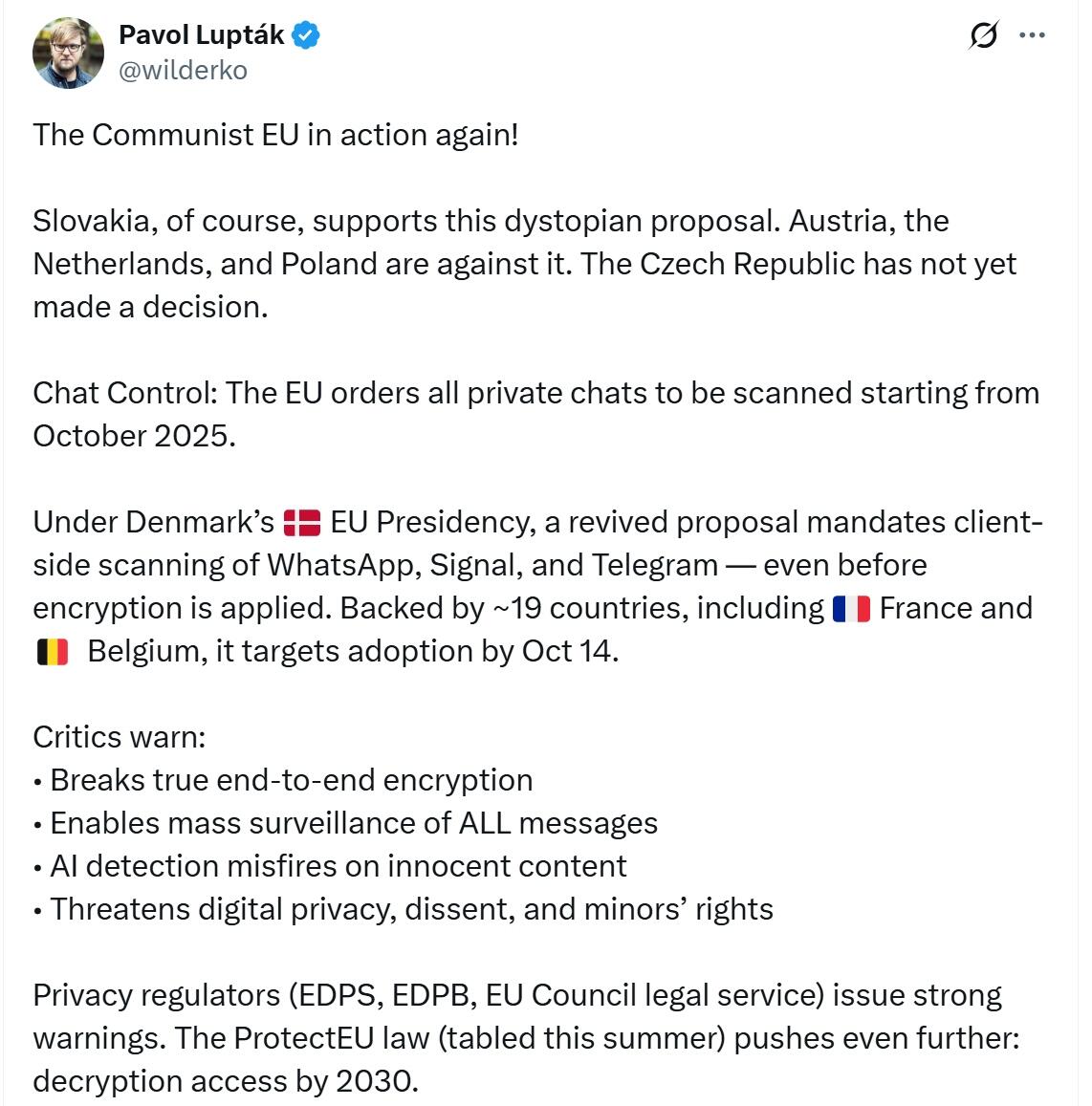 He added that the real target isn’t criminals, who use encrypted or decentralized channels, but ordinary users whose private conversations would now be open to algorithmic scrutiny.