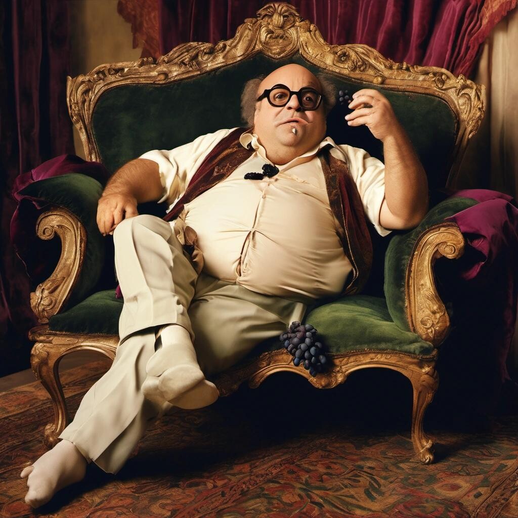 nostr:npub1p5qe4mtwxascahtp6szght2nlp06gwwwwllq7e7g6308p4y9dvys8nw2sf draw for me Danny devito in lingerie eating grapes on a fainting couch in the Renaissance style