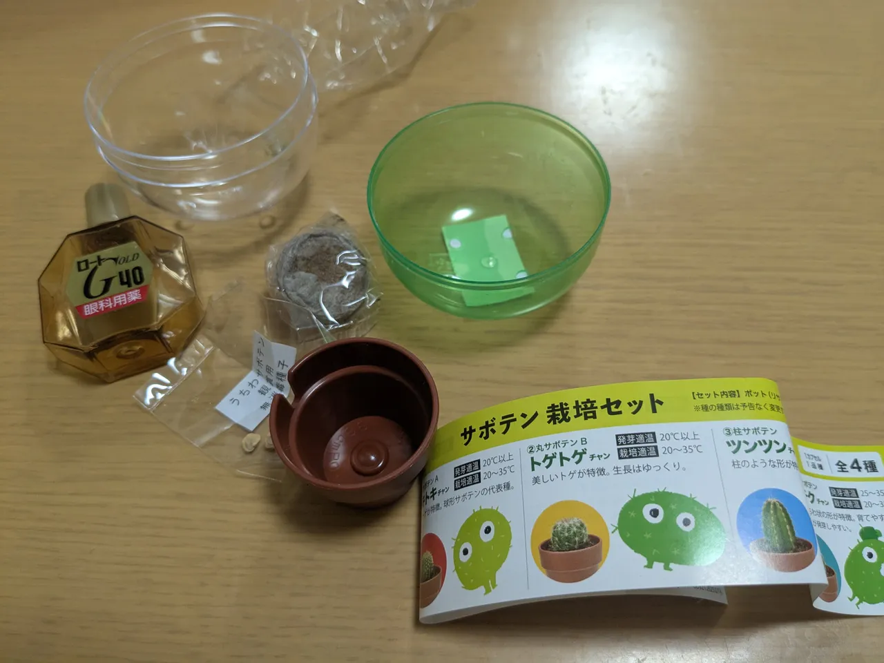 これはガチャガチャから出てきたサボテン栽培セット(400円)と大きさ比較用の目薬
