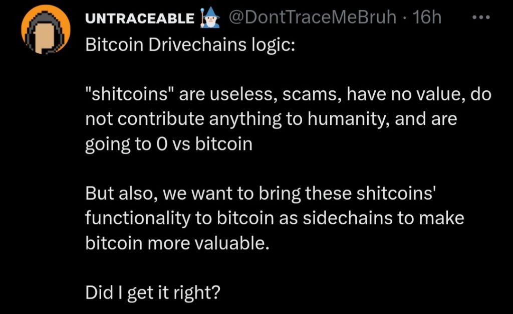 The old btc dev philosophy was “anything that can be built will eventually end up on bitcoin.” Glad to see this discussion of BIP-300 coming to the surface again. Drivechain propents recognise the innovation on other chains and they wish to bring it to bitcoin.