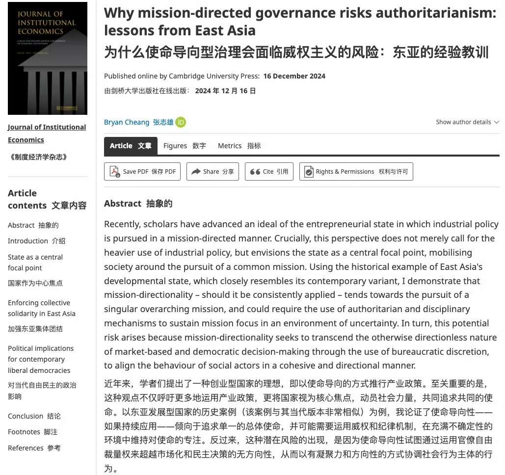 “近年来,学者们提出了一种创业型国家的理想,即以使命导向的方式推行产业政策。至关重要的是,这种观点不仅呼吁更多地运用产业政策,更将国家视为核心焦点,动员社会力量,共同追求共同的使命。以东亚发展型国家的历史案例(该案例与其当代版本非常相似)为例,我论证了使命导向性——如果持续应用——倾向于追求单一的总体使命,并可能需要运用威权和纪律机制,在充满不确定性的环境中维持对使命的专注。反过来,这种潜在风险的出现,是因为使命导向性试图通过运用官僚自由裁量权来超越市场化和民主决策的无方向性,从而以有凝聚力和方向性的方式协调社会行为主体的行为。”