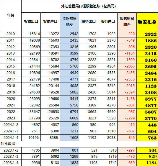 从外汇管理局新鲜热辣发布的外贸收支数据来看,今年1-4月份,货物贸易顺差1608亿,较去年同期的1823亿,缩减了11.8%。与此同时,服务贸易逆差845亿,较去年同期的639亿,扩大了32.2%。如此消长的结果,就是1-4月份的全口径顺差763亿,较去年同期的1184亿,暴跌了35.6%,并且这种降幅还呈现出清晰 的逐月放大之势。