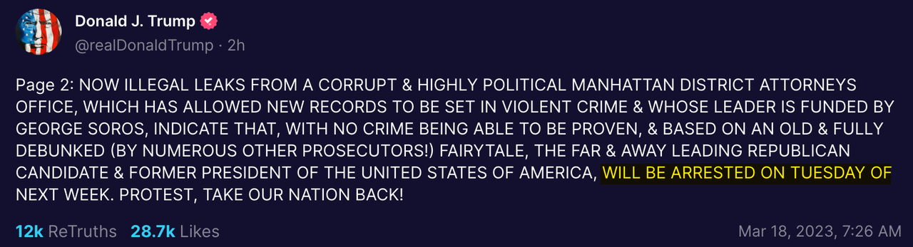 Trump has announced to the world that he's been indicted in the Stormy Daniels bribery case, and is being arrested on Tuesday. Wasn't hoping for a week of political violence in the US, given it being my birthday and all. But here we are.