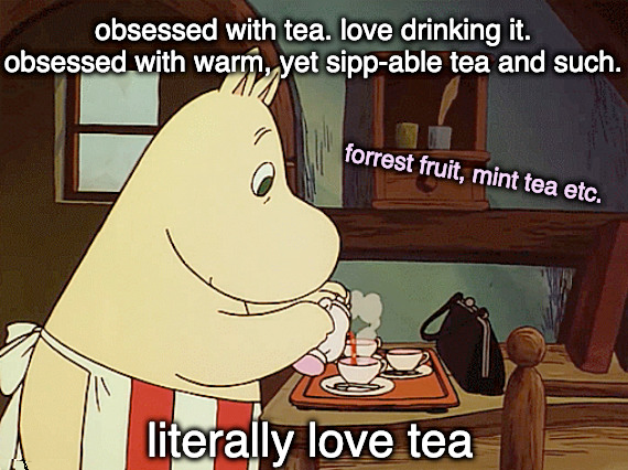 "obsessed with tea. love drinking it. obsessed with warm, yet sipp-able tea and such. forrest fruit, mint tea etc.