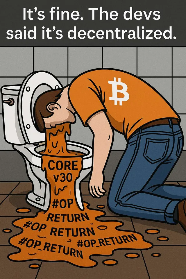 Maxi with head in toilet labeled “Core v30,” OP_RETURN sewage flooding in?