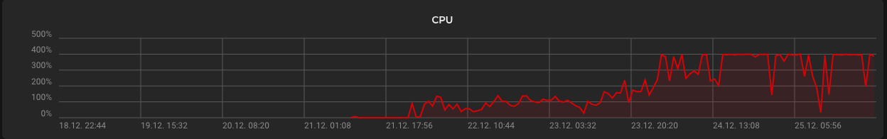 Before christmas it was running at 30% per core but seems like all four cores are firing at full power now