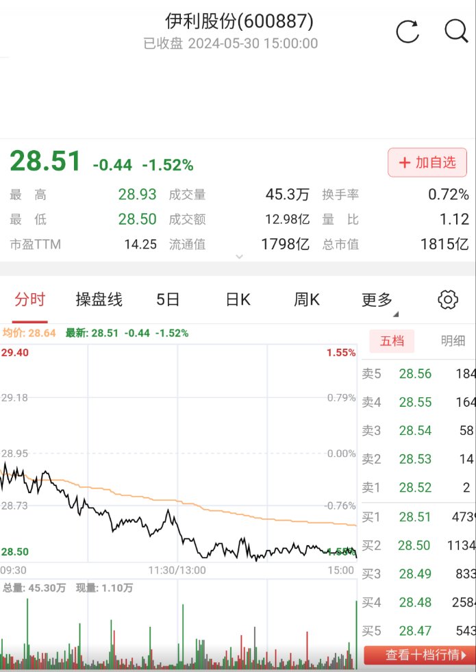 目前,伊利关闭了账号评论区,截至5月30日,伊利股价也发生下跌。