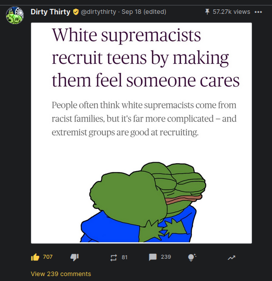 it's a little fucking gem and cunt in the same basket once you get the wheels moving, shit Elf Tummy's artwork from his license to fill, Raul's Lum posting, or even Randbot's going live poasts for streaming is enough to generate some results, absolutely love seeing someone go from minds and join another platform and sub to Rand, White Rabbit, etc... there's a few NJP fans over there now. in almost the timeframe i've only been able to gain 300 some on shitter because of the international jew fuckin' with my frens
