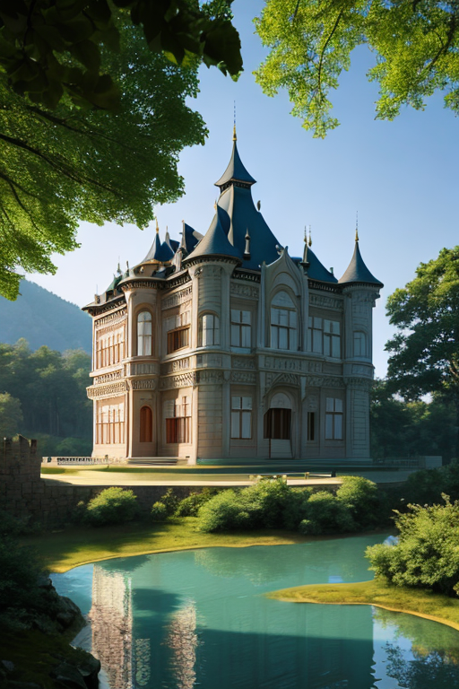 nostr:npub102ca8pnhy26vh2akepgr4vleyew65nuzug5val3sycslfe0wruwqzezyfp imagine a palace in the mountains with a moat and surrounded by forest with a dragon
