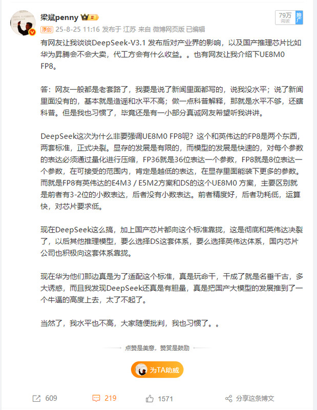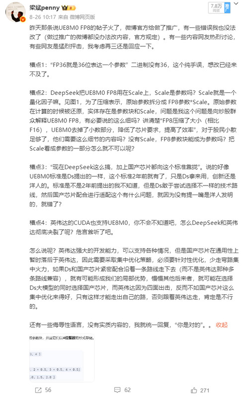 给股民讲解这个,就说FP8降低显存要求,UE8M0 降低芯片设计难度,提高计算效率,这又有什么问题呢?一定要把所有技术细节讲完,股民才能彻底理解吗?不讲完全部技术细节就是水平不高?我要那么高干什么呢,又不能当领导。。关键那些真是对什么人都把技术讲明白的,反而当不了领导,永远被印度人领导吧[允悲]
