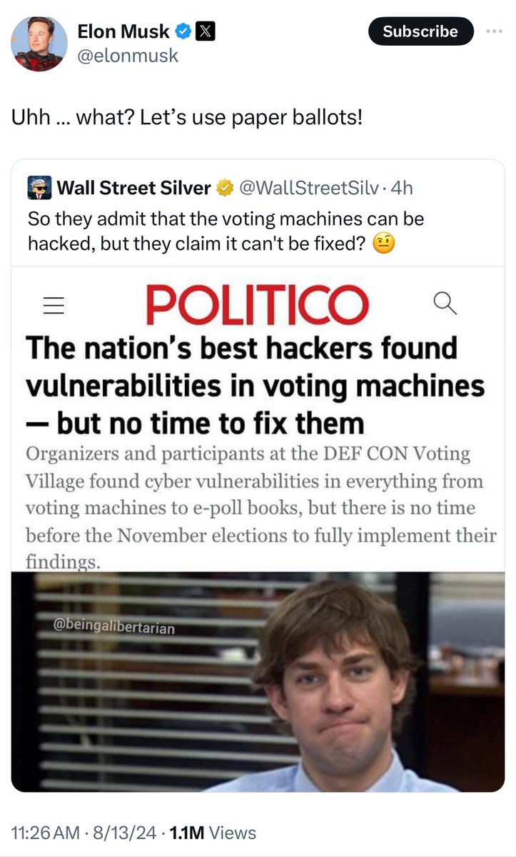 RT @SSK2024: 🔥马斯克:呃......什么? 还是用纸选票吧。