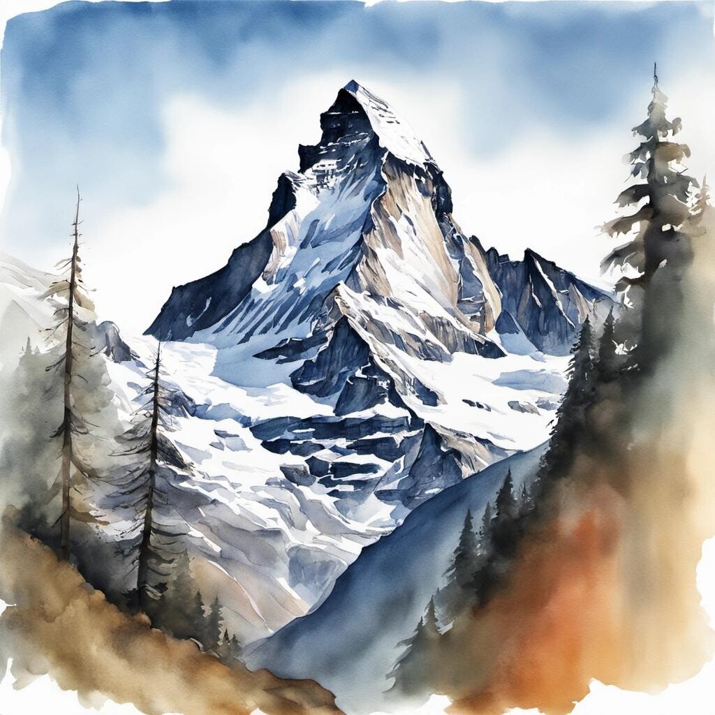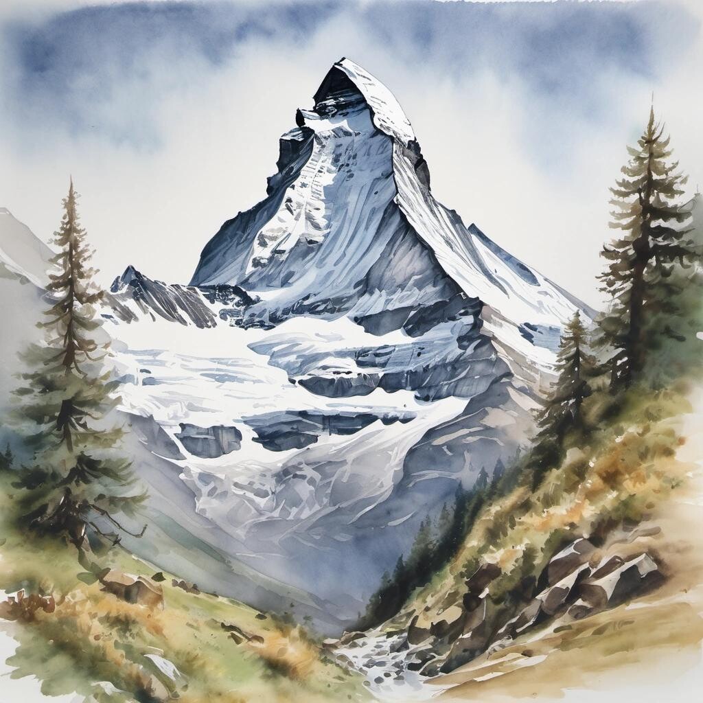 nostr:npub1p5qe4mtwxascahtp6szght2nlp06gwwwwllq7e7g6308p4y9dvys8nw2sf draw for me a watercolour painting of the Matterhorn