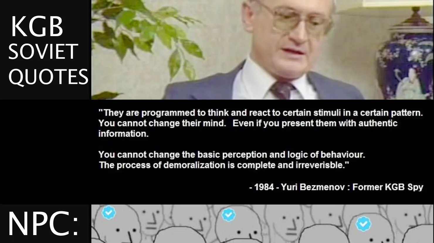 You can shower left and woke all day with facts that are just and truthful, always will be rejected in modernity woke clown times. 1984 Yuri Bezmenov ~Former KGB Spy of Soviet union.