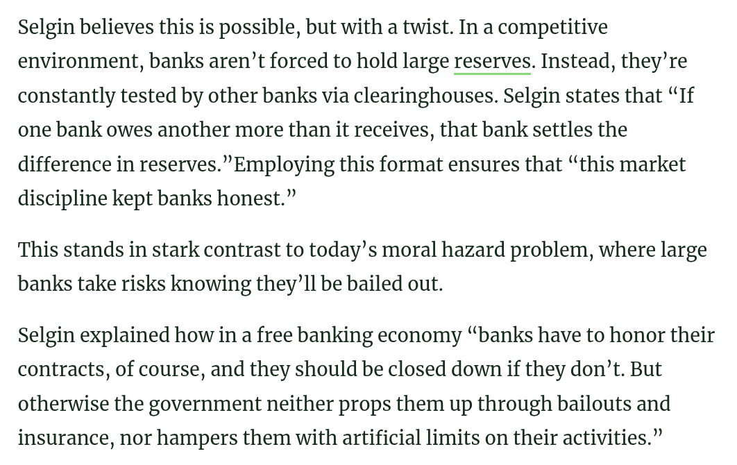 I'm sympathetic to this view, it's not however clear to me whether free banking on top of gold was a solution to the technical limitations of the time and if it would make sense on top of Bitcoin (yes it's slow, but still much much faster and cheaper than transferring gold was)