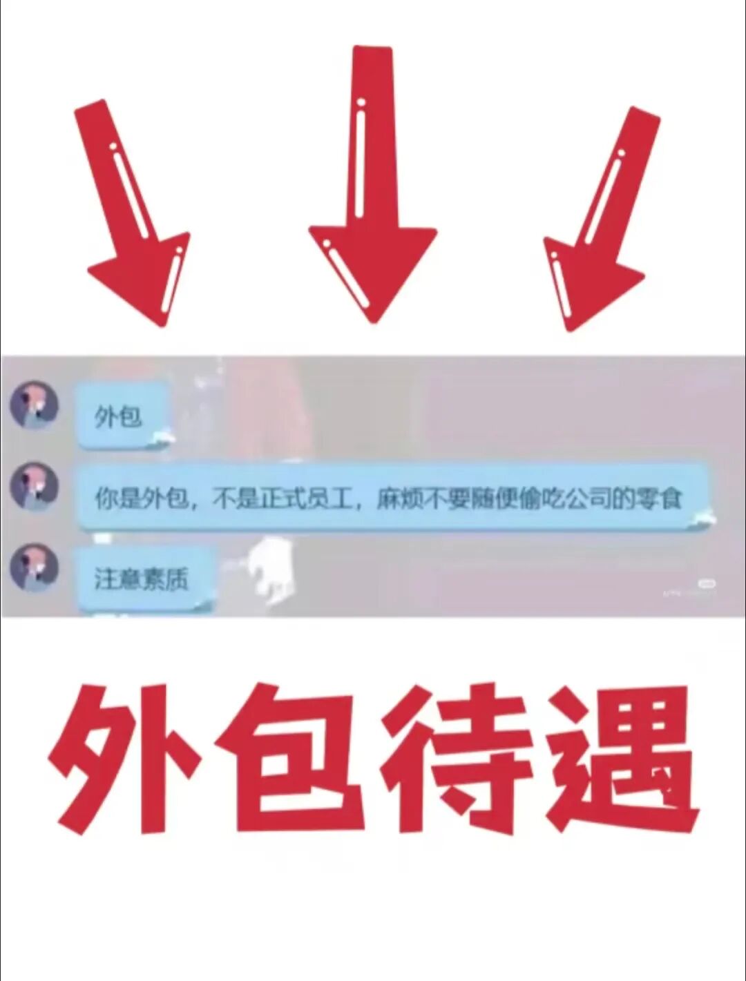 在此之前,外派员工只能作为“三等公民”存在,正编是嫡子,内包是庶子,外派是养子。甚至外派员工因为吃了公司的下午茶被追究法律责任,外派吃了零食被提醒注意素质。
