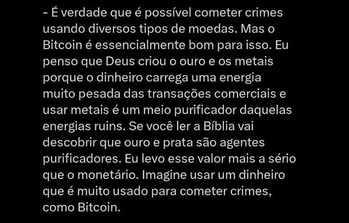 Em um comentário maior, entre outras coisas, ele entra em um argumento viajado de que o Bitcoin ajuda mais ao crime e que a Biblia diz que o ouro e a prata são purificadores...
