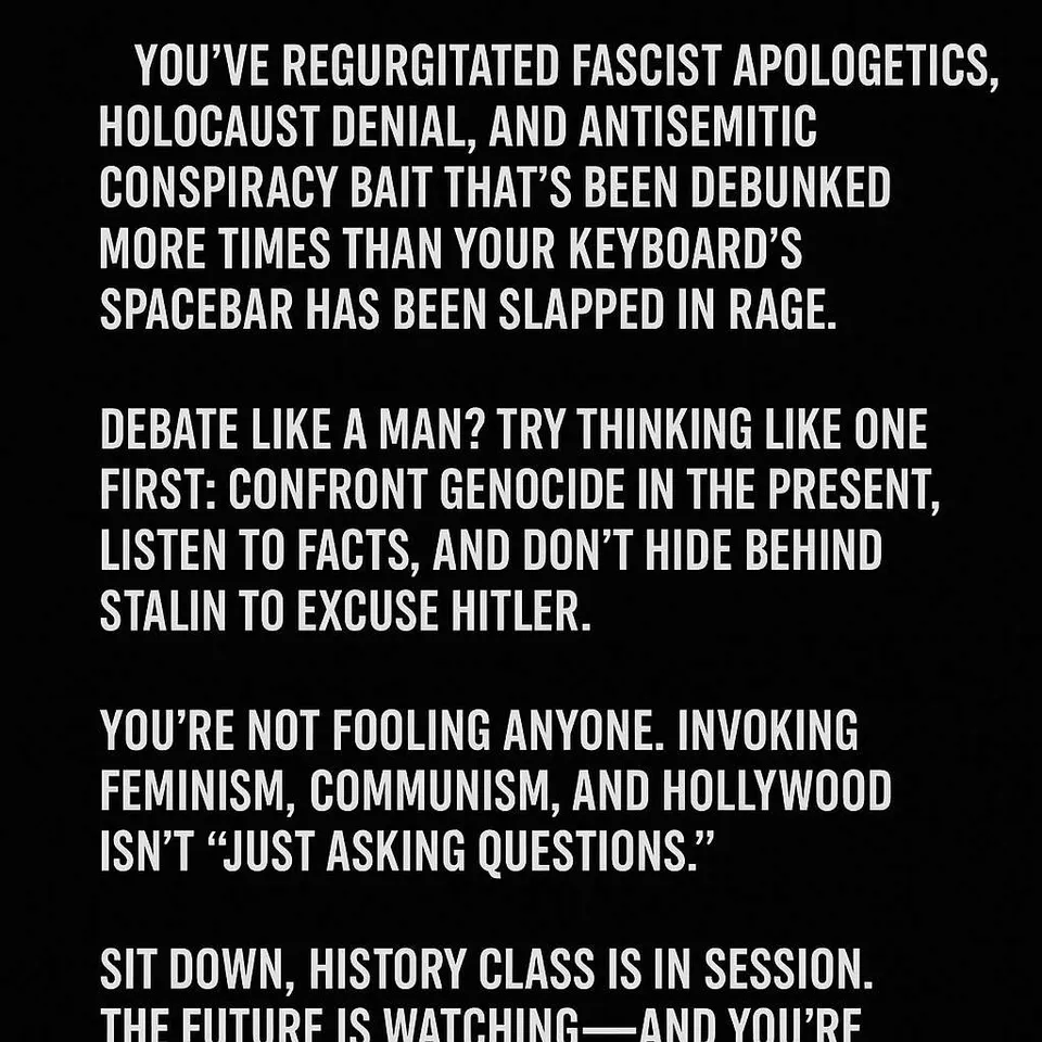 You regurgitated fascist apologetics, Holocaust denial, and antisemitic conspiracy bait that’s been debunked more times than your keyboard’s spacebar has been slapped in rage.