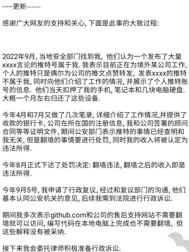 9月24日,一名微博网友称,自己因为翻墙使用github工作被承德公安局双桥分局处罚没收上百万元。