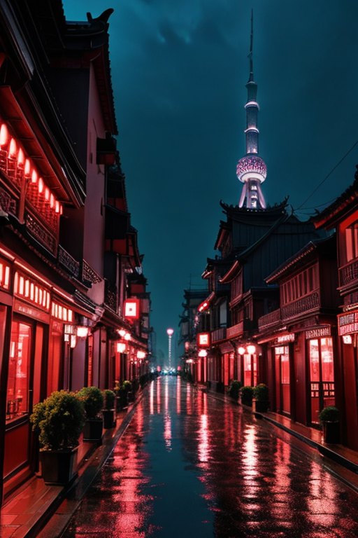 nostr:npub102ca8pnhy26vh2akepgr4vleyew65nuzug5val3sycslfe0wruwqzezyfp imagine a photograph of Shanghai by night. It is rainy and the and the sky is glowing red. Show the detailed architecture and streets evoking a kind of romance for the city.