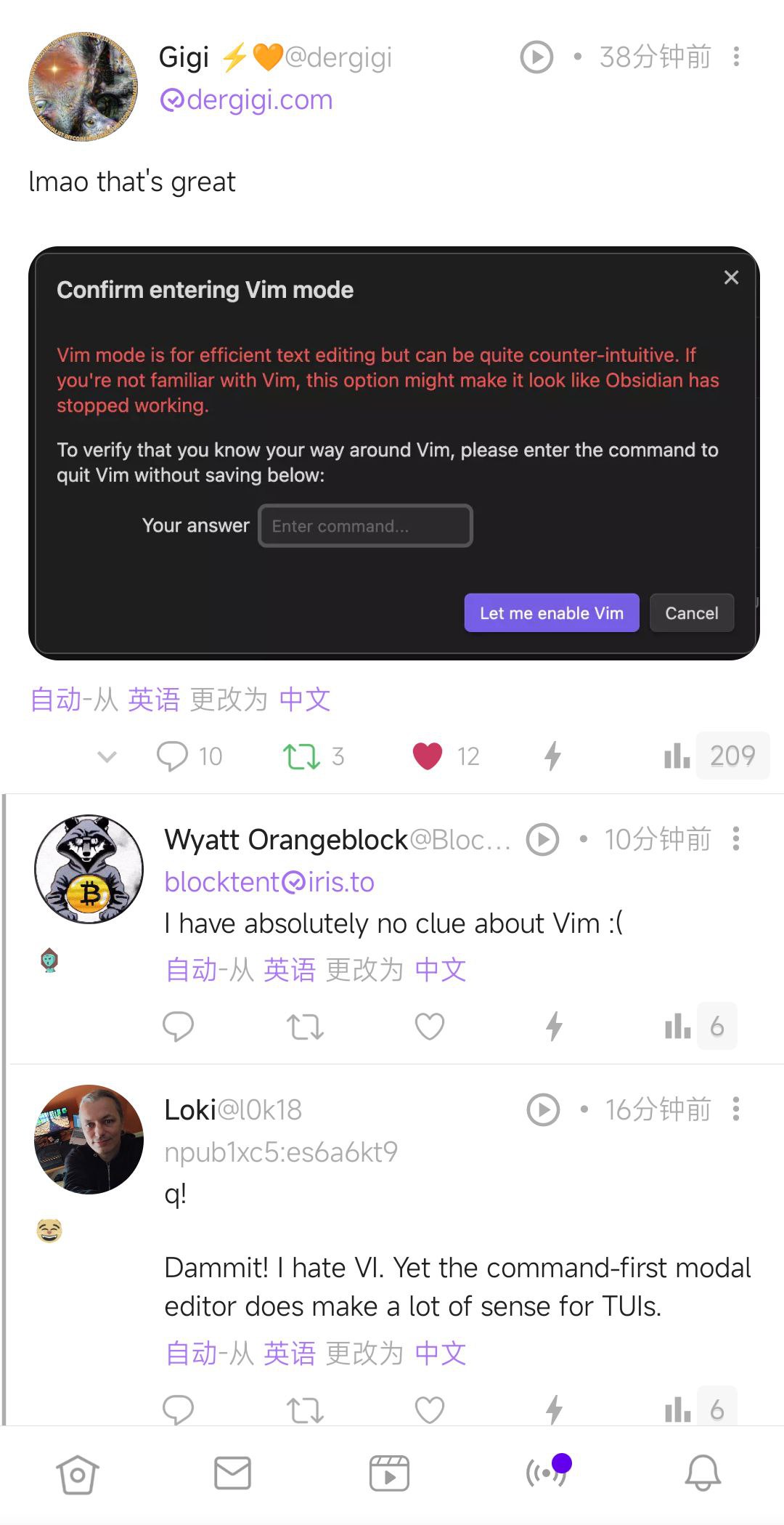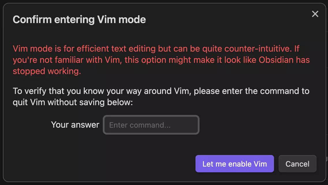 Vim 模式用于高效的文本编辑,但可能相当反直觉。如果您不熟悉 Vim,这个选项可能会让您感觉 Obsidian 不听使唤了。
