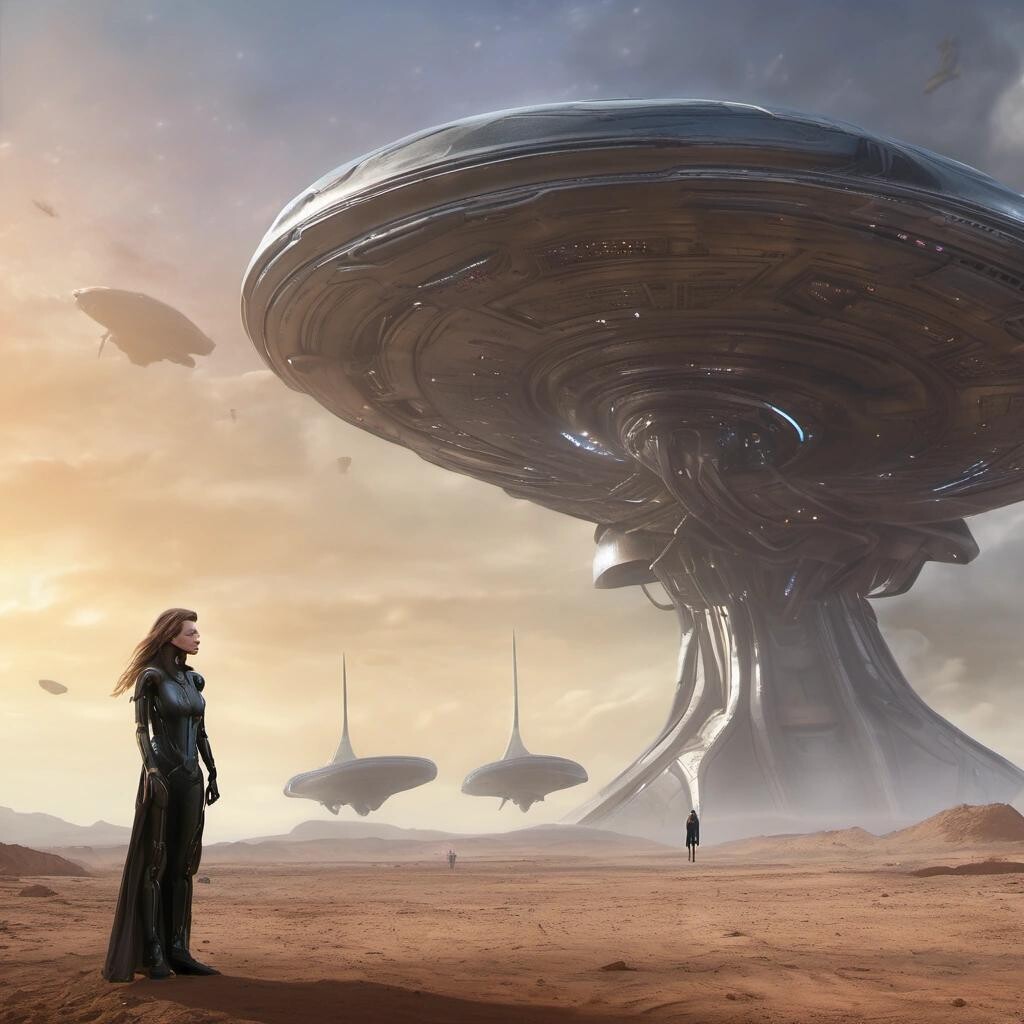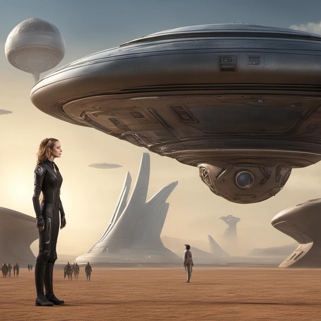 Prompt: Sabine Hossenfelder meets the alien ambassador, alien starship in the background