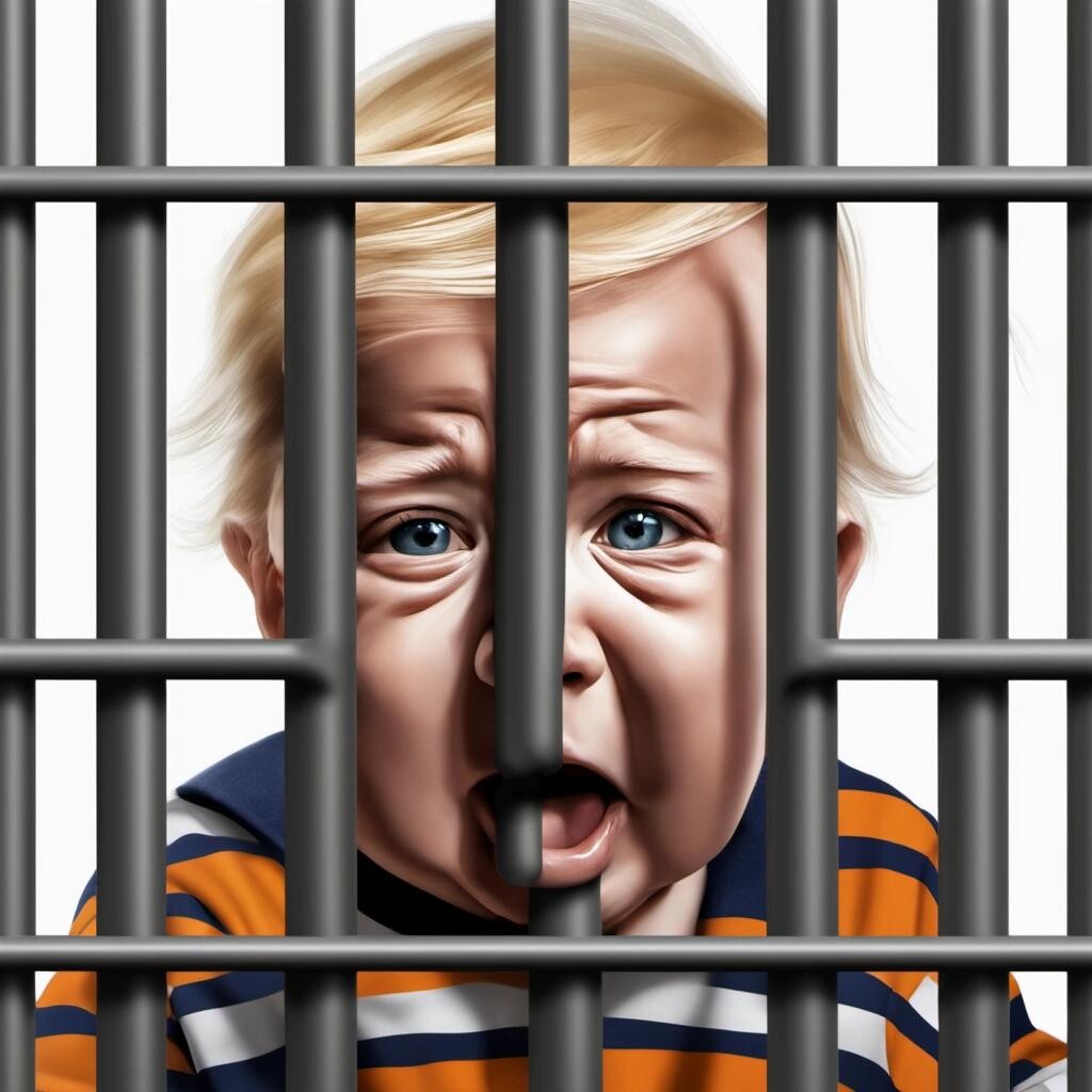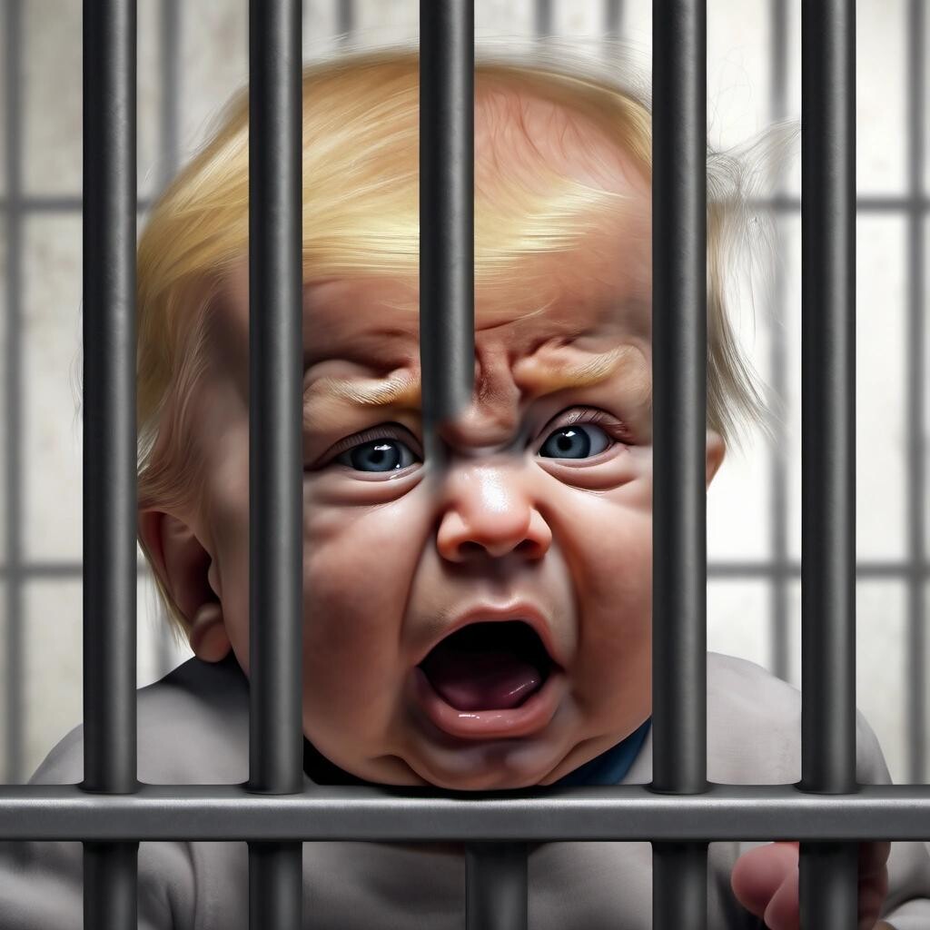 nostr:npub1p5qe4mtwxascahtp6szght2nlp06gwwwwllq7e7g6308p4y9dvys8nw2sf draw for me a Donald Trump faced baby crying in a jail cell behind bars, detailed, high quality, beautiful, hyper realism, 8k
